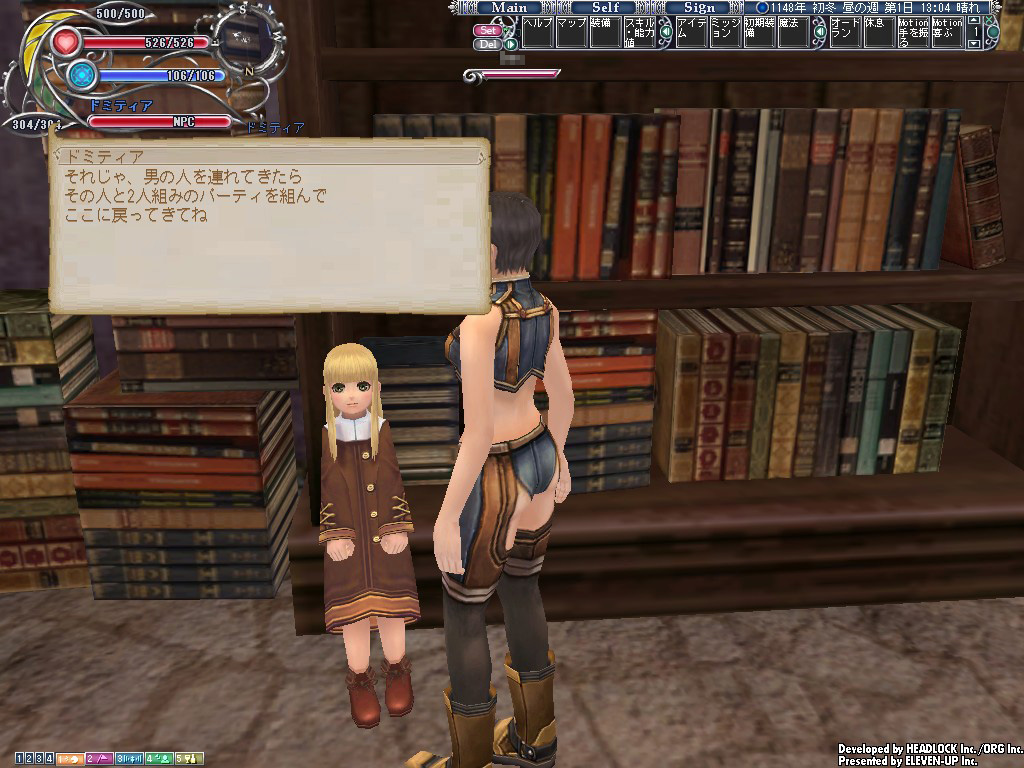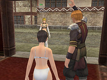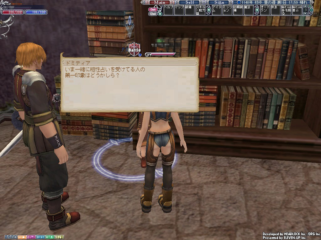 Emmaの口座はビキニで満たされたが,心は未だ満たされず。ここで普通にお礼を言って帰してしまったら,次のステップにつながらない! そこでEmmaが,もう一つ潤んだ瞳でおねだりしたのは,初心者ミッション「占い師見習い」の同行だ。このミッション,難しいことは何もないのだが,異性キャラクター同士が二人きりでパーティを組んで,NPC「ドミティア」の質問に答えるという内容がポイント。