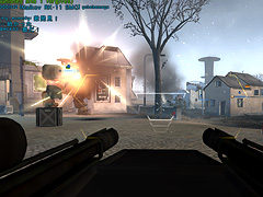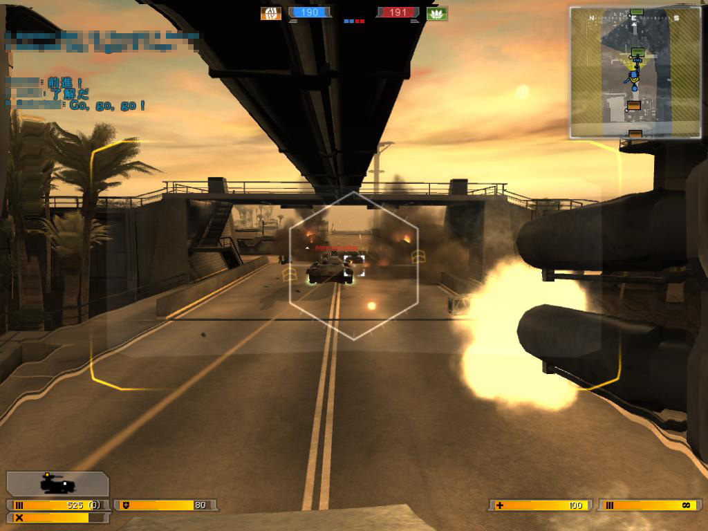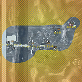 戦場は広く,兵器類も豊富なアサルトマップ。攻撃側のPAC軍の場合,自らの野営地から敵の拠点に近づくには,コンクリートブロックがじゃまっけな隘路を通らざるを得ず,しかもEU軍の拠点「前線」には背の高い建物があるため,こちらの接近が容易に暴露してしまうという不利な地形。拠点「前線」はまさに最前線で,そこでの正面衝突は避け得ない。16人用マップを除いて待望の航空機が登場する。とはいえ,出てくるのはガンシップのみで輸送機はなしだ。いったん前線を抜いてしまえば,あとの勝負は互角か,もしくはややPAC軍有利で推移するだろう。