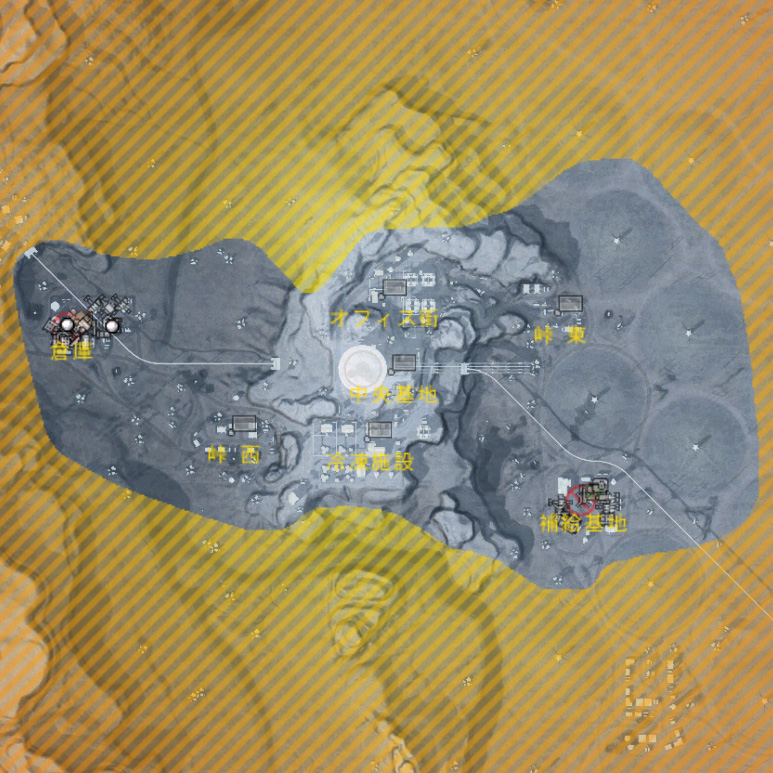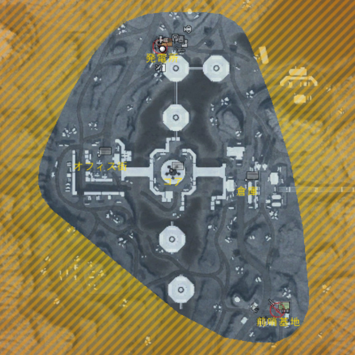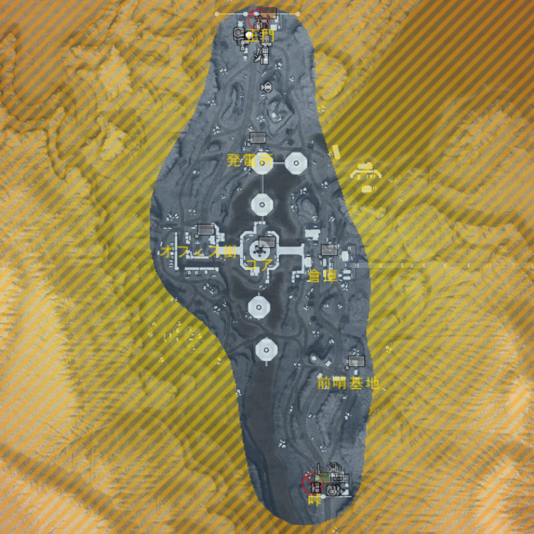 こちらもすべてヘッドオンマップ。水路を挟んで拠点が東西に分かれるため,中央の拠点「コア」をどちらが占領するかで勝敗が変わってくる。水路があるため地形はやや入り組んでおり,地理に詳しくなければ余計な回り道を強いられたりする。(16人用マップ以外では)やはり,序盤は輸送機を使って空から展開するのがいいだろう。多くの拠点で強力な兵器がリスポーンするので拠点を奪われれば奪われるほど不利になる。