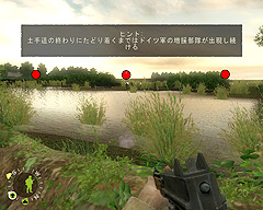 土手道の終わりに無事辿り着いたが,すでに敵に迂回されていた。敵数人とはいえMG42が真正面から狙っており,不用意に攻め込むと大きなダメージを受ける。とくに難度リアルでは,ここで戦死すると冒頭からやり直しとなるため,慎重に行動したいところだ。