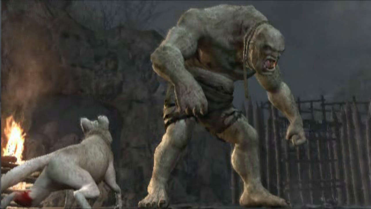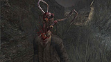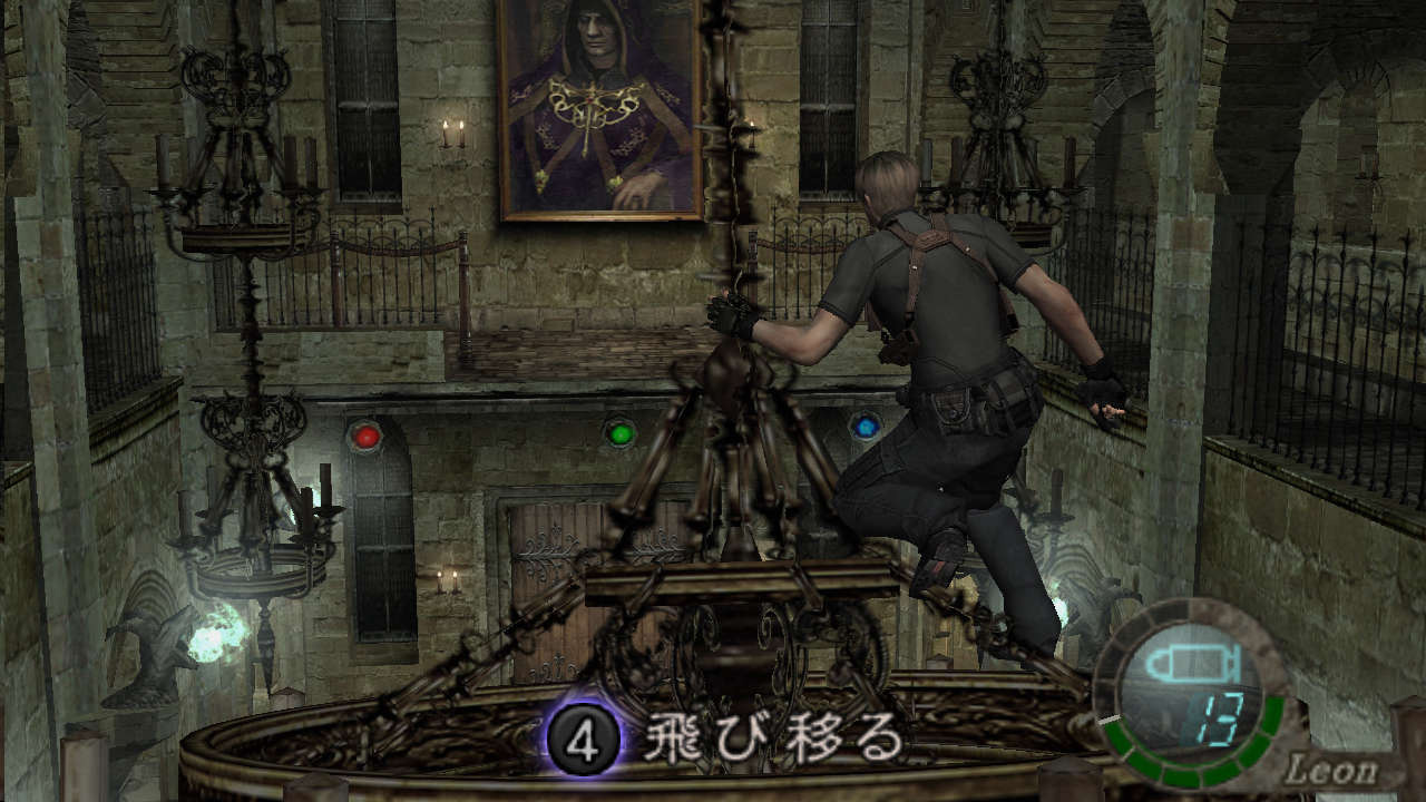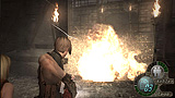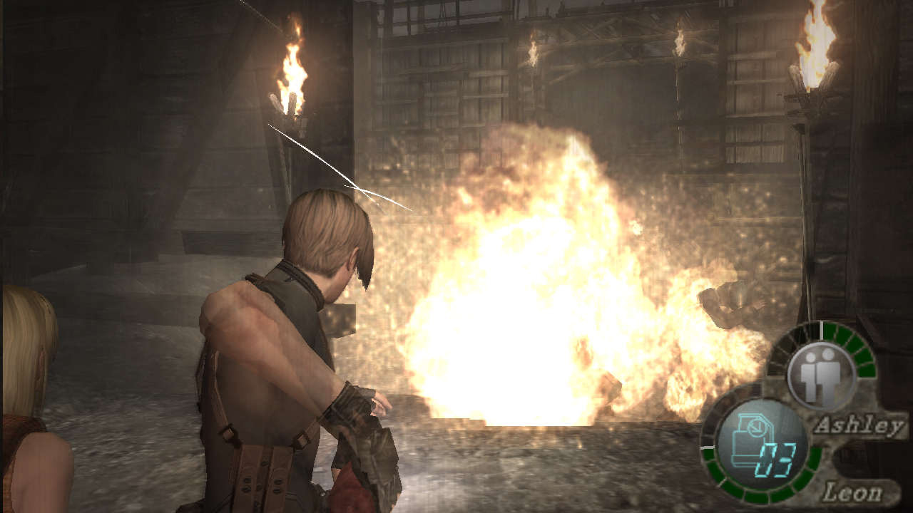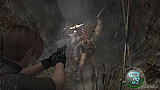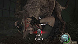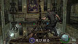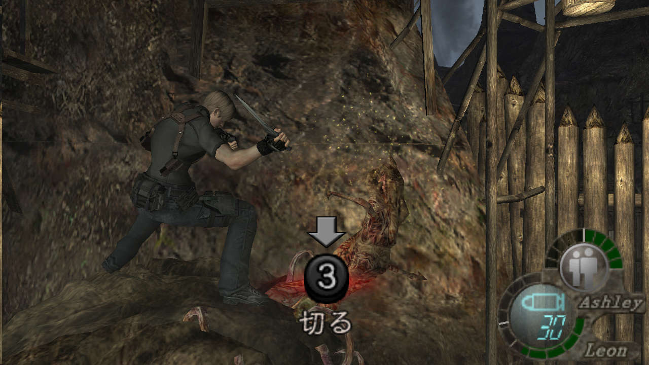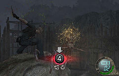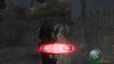 さて,具体的にはどうするかといえば,エルヒガンテが登場したら,頭上にある大岩を落とし,足止めをする。その隙に,鎖がかかっている扉を開けてひとまず奥に逃げよう。扉は十数回蹴らないと開かないのだが,ナイフでサクサクッと斬れば2,3回で鎖は切れる。マップの最東端までアシュリーを連れてきたらその場で待機させ,レオン一人でエルヒガンテのところに戻る。最初の扉までのエリア限定で戦えば,アシュリーがエルヒガンテに捕まる可能性はかなり低くなる。