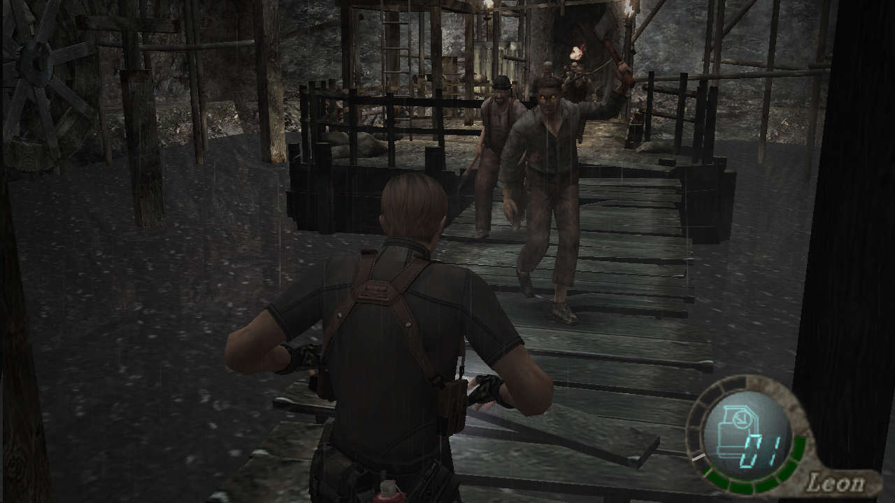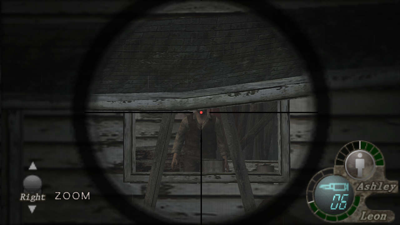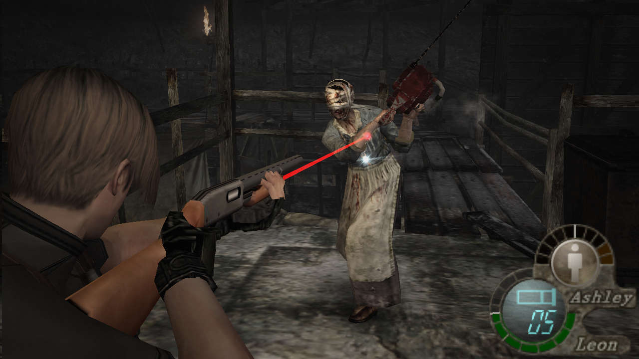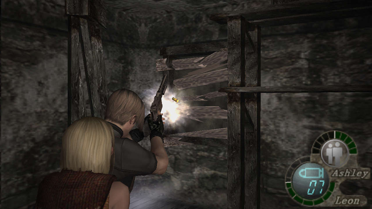 深い川の上にかかる吊り橋を渡るとムービーが再生され,空き家での籠城戦がスタートする。小屋の中へワラワラと立ち入ってくるガナード達を,NPCキャラのルイスと協力して排除するというものだ。