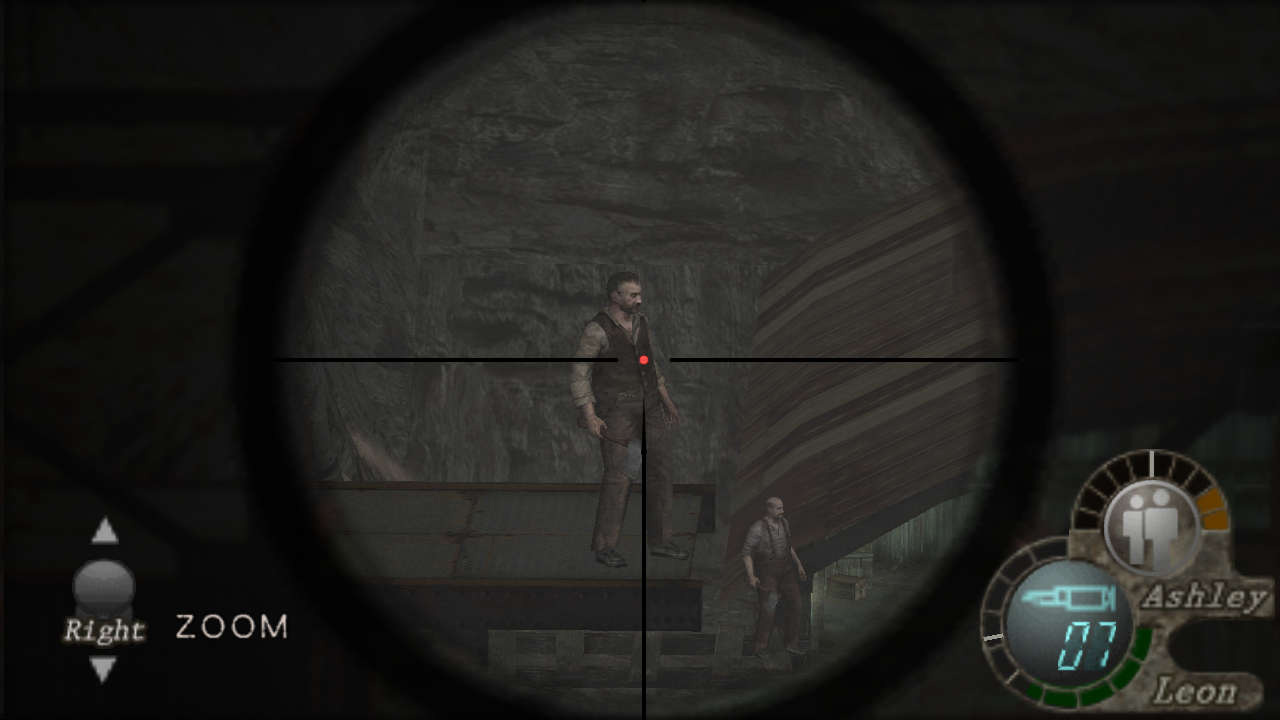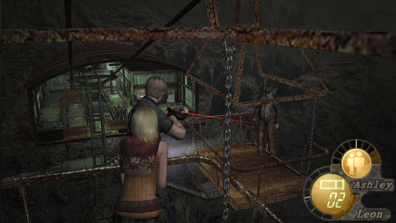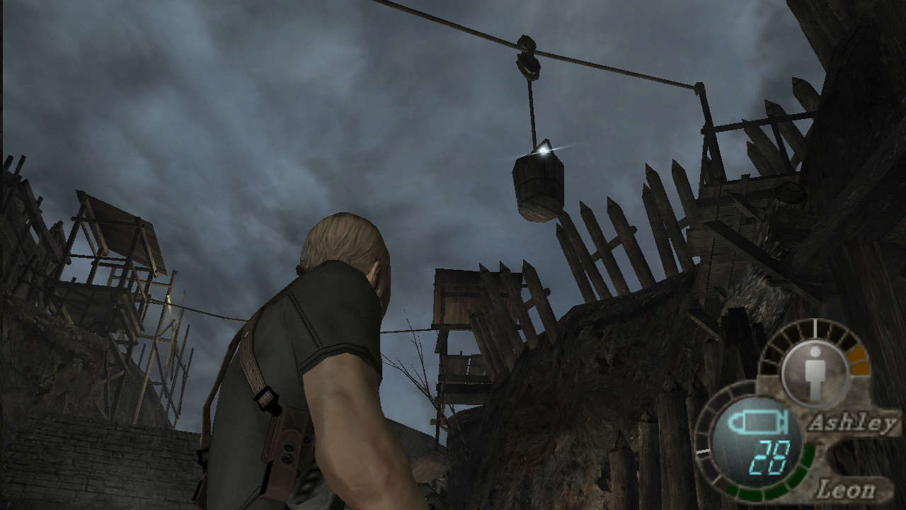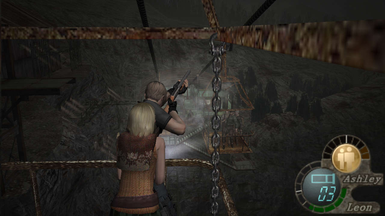 ゴンドラでは一息付けそうな気もするが,上りのゴンドラにガナード達が乗っていて,攻撃を仕掛けてくるので気を抜かないように。とくにゴンドラのシャフト左手の崖に立っているガナード達は,放置していると,レオン達が乗っているゴンドラを谷底に落とそうとする。ゴンドラに乗る前に,乗車地点からライフルで狙撃しておくべし。