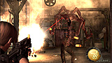 中ボスに一定量のダメージを与えると,上半身と下半身がスッパリと分離。上半身だけで梁をつたいながら移動しつつ攻撃してくる。動きがかなり立体的になるので,できれば2階に上って迎え撃ちたいところだ。1階で戦うときは,閃光手榴弾を投げつけて地面へたたき落とし,地面に這わせたところに銃弾をバリバリと撃ち込むのがお勧めだ。