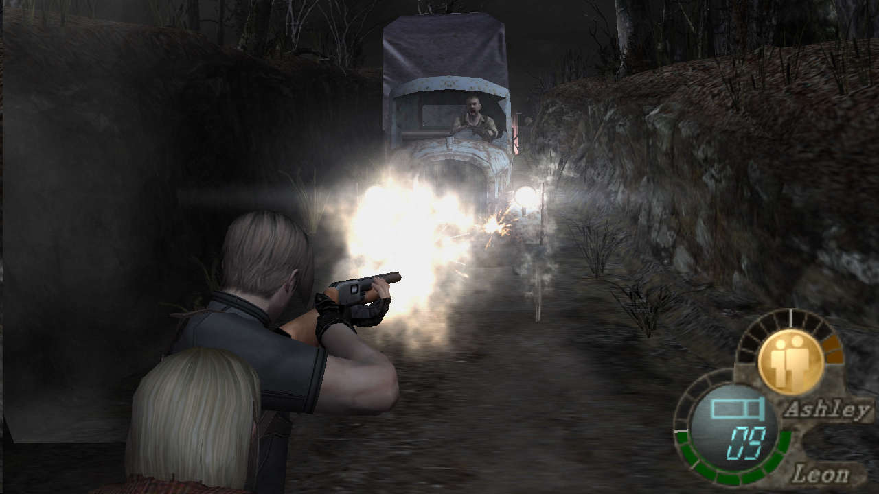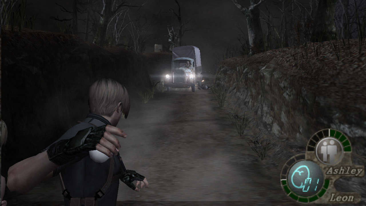 扉を開けたあとはなだらかな一本道なのだが,ここでは暴走トラックがレオン達に向かって突っ走ってくる。回避する方法は,運転しているガナードを射撃するか,タイヤを撃つかのどちらかしかない。ガナードを狙撃するのはちょっと難度が高いので,狙撃に自信のない人は,より当たり判定が大きいタイヤを狙おう。なお狙撃とはいっても,ライフルを使う必要はなく,ショットガンでもOKだ。失敗すると,ご想像どおり即ゲームオーバーとなるので気をつけてほしい。