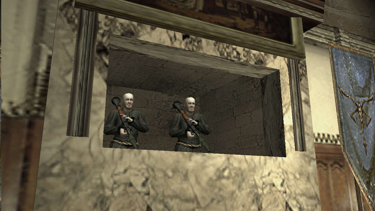 続く食堂では,壁にかけられた黒板(?)に書いてある四つのメッセージをよく読むこと。これらのメッセージを覚えたら,鉄格子のかかった扉脇にあるカウンターでベルを鳴らし,奥にかかった絵画を撃つ。順番に撃つ必要はなく,最後の一品だけ撃てばいい。