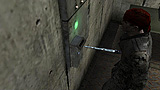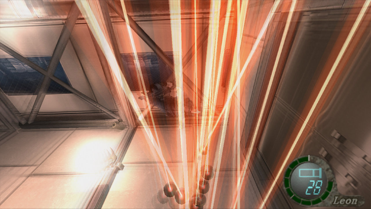 無事アクションボタン付きムービーをクリアしても,まだ気を抜けなかったりする。次は工場のような油臭いイメージを払拭する,近未来的で無機質な感じがする一本道の通路。「ほへー」と思いながら進むと,レーザービームが行く手を阻む。最初の2回はタイミングを合わせて前進するだけでいいのだが,レーザーに触れると即死なので気を付けるべし。タイミングとしては,上下移動する横向きのレーザーが上に行ったあと,通れる隙間が出来た瞬間に前進すればいい。そのあとはアクションボタンを4回入力する必要があるので,気を抜かずに。