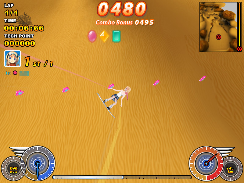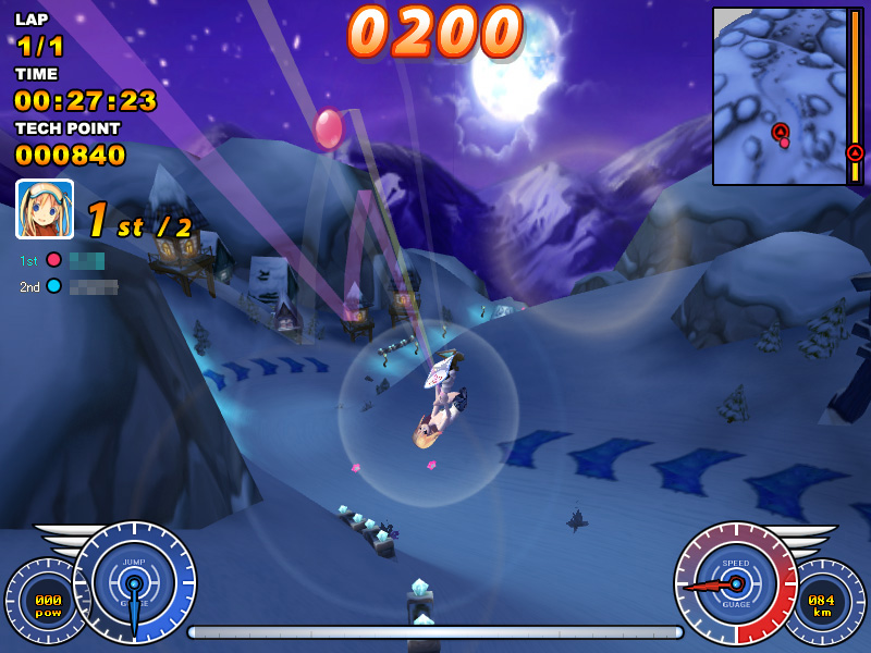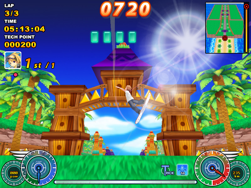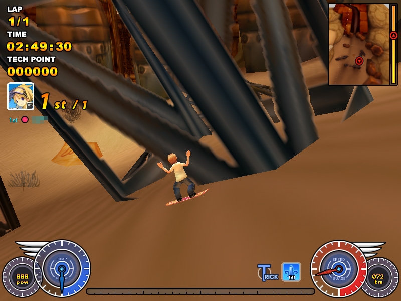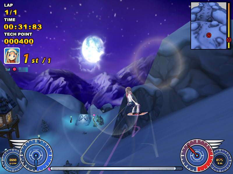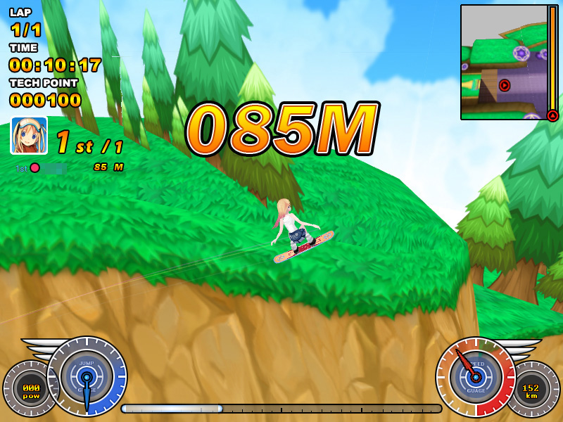 スノーボードに乗りひたすら猛スピードで坂を下っていくわけだが,基本ルールは既存のレースゲームとほぼ同じで,障害物をよけながら制限時間内にコースを完走することが目的。操作方法はカーソルキー左右の移動と,上下カーソルキーのアクセルとブレーキのみで,極めてシンプル。途中に設けられたジャンプ台やコースの地形でジャンプしている間,空中で「Altキー」や「Shiftキー」とカーソルキーを押して決める「トリック」(技)が,「テックポイント」として加算されるのがスノボっぽい要素だ。無事完走すると,タイムとテックポイントの総合判定によって,経験値を獲得する。