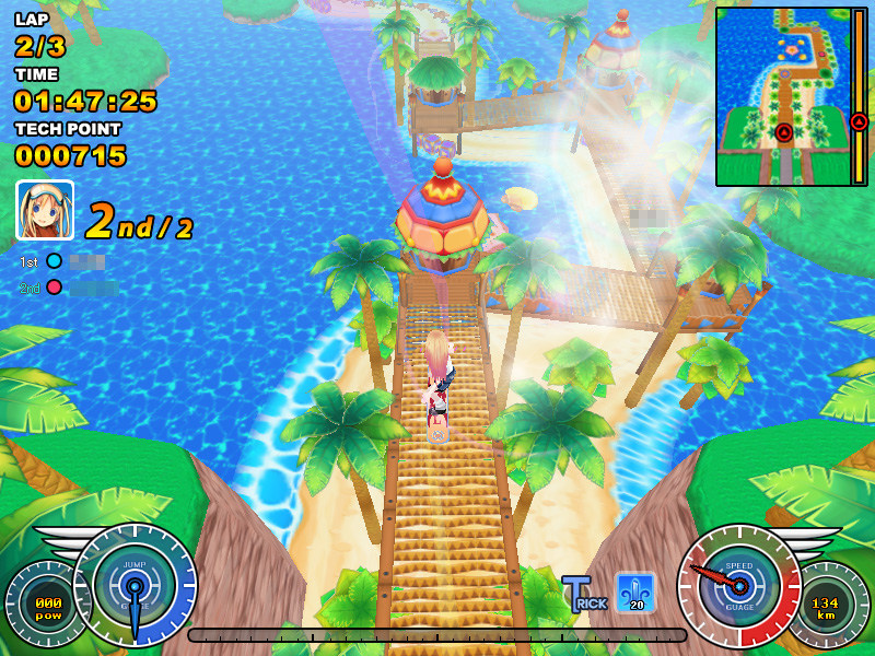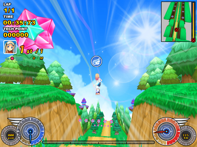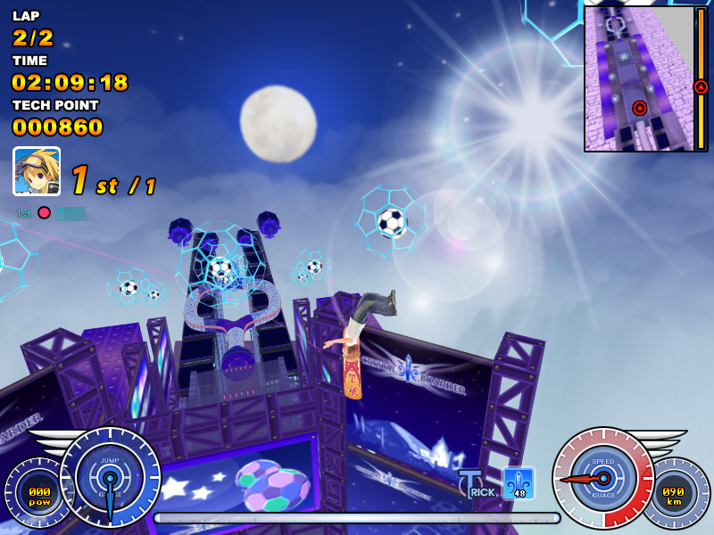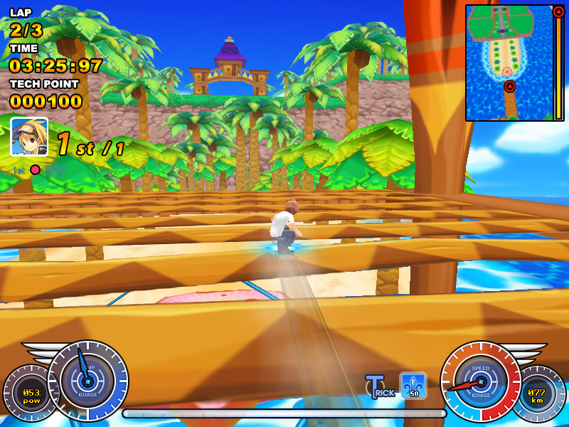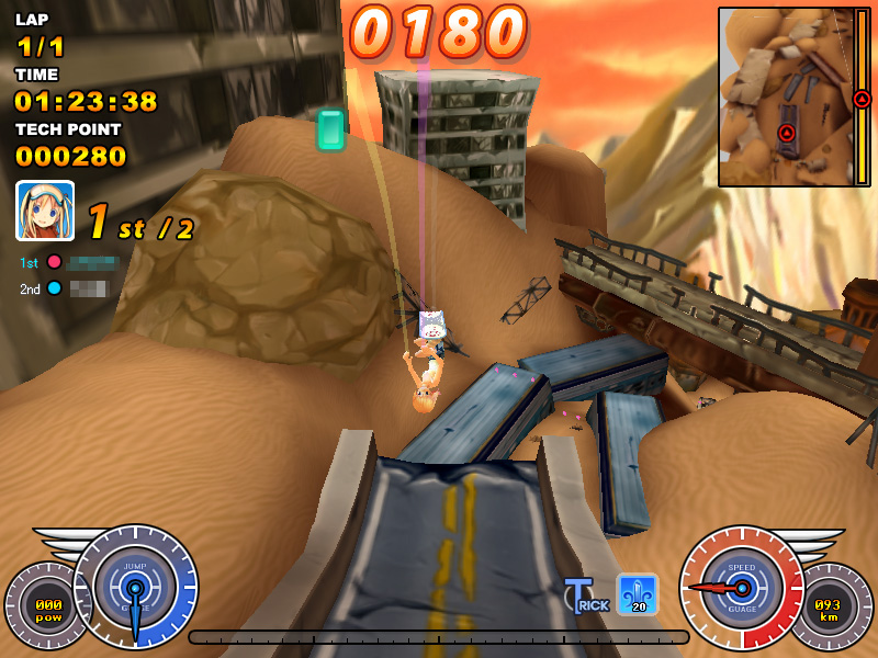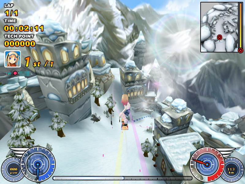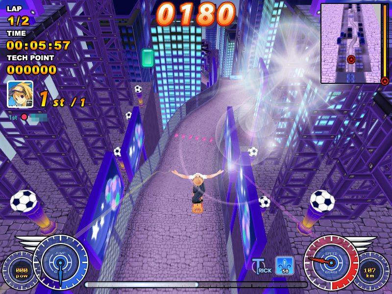 スノーボードに乗りひたすら猛スピードで坂を下っていくわけだが,基本ルールは既存のレースゲームとほぼ同じで,障害物をよけながら制限時間内にコースを完走することが目的。操作方法はカーソルキー左右の移動と,上下カーソルキーのアクセルとブレーキのみで,極めてシンプル。途中に設けられたジャンプ台やコースの地形でジャンプしている間,空中で「Altキー」や「Shiftキー」とカーソルキーを押して決める「トリック」(技)が,「テックポイント」として加算されるのがスノボっぽい要素だ。無事完走すると,タイムとテックポイントの総合判定によって,経験値を獲得する。