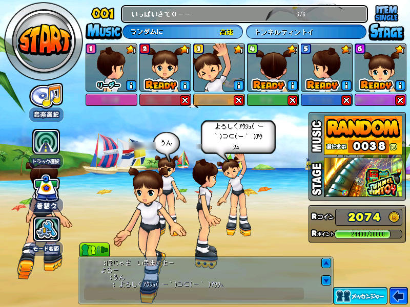 キャラクターはアニメ調の男女どちらかを最初に選択。顔や髪型はこの時点では変更できず,お洒落や個性を楽しみたければ,ゲーム内通貨を貯めてアイテムショップで購入する。このR2BEAT,韓国版ではただの白いシャツに黒い短パンというスタイルがデフォルトなのに,日本版はいったいどこのターゲット層に合わせたのか,女の子キャラクターは体操着+ブルマというスタイルなのだ。