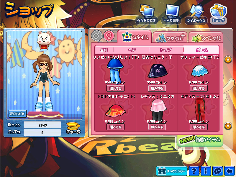 アイテムは安くても3000コイン程度からと,なかなか値が張る。つい出来心でスクール水着を試着してみたり |
