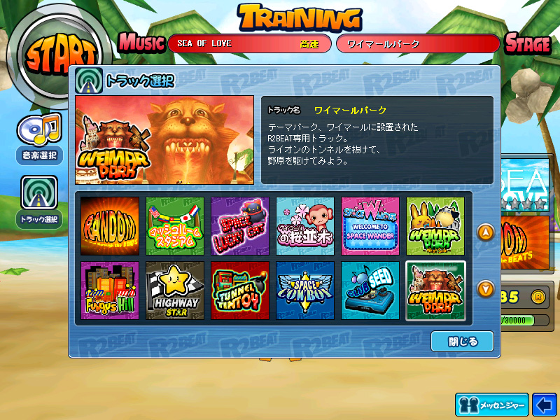 トラック(マップ)もほんわか田園風景から,学校の廊下,ピンクにまみれた桜並木など,選択肢は幅広いので,気分とレベルに合わせてプレイが楽しめるのもR2BEATの魅力といえよう。操作がまだおぼつかない初心者にオススメしたいのが,クラシック音楽「愛の挨拶」をアレンジしたもの。誰もが一度は耳にしたことがある馴染みやすいメロディで,「超高速」に設定してもプレイしやすく,いい練習になるだろう。