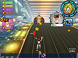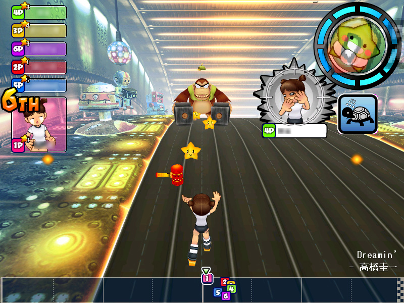 「アイテム戦」ではコース途中に落ちている「?」をゲットすると,ランダムでアイテムを一つ入手できる。Ctrlキーを押すことで入手したアイテムの効果が発動するのだが,ライバルの動きを封じるお邪魔アイテムだったり,お邪魔アイテムの効果を打ち消す防御アイテム,逆にブーストをかけてくれるサポート系アイテムだったりと,何が出るかは取ってみなければ分からない。お邪魔アイテムには,スピードを極端に落とす「タートル」や,音楽を聞こえなくしてしまう「妨害電波」,相手を凍らせる「アイスロック」などの種類があり,使われると実に腹立たしい……。