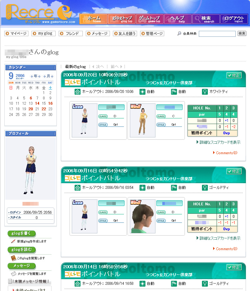 もう一つ,ゴルトモの重要な機能として「glog」がある。glogは,ゴルトモの登録ユーザーが閲覧できる,SNS(ソーシャルネットワークサービス)のこと。単に日誌を書くだけのツールではなく,ゴルトモと連動しているのが大きな特徴。各ゲームモードでの対戦結果(スコア表)は自動的に記録され,ロングパットを決めた瞬間やパー以下でカップインしたときの画像なども勝手に撮影して,glog上に自動で掲載してくれるのだ。