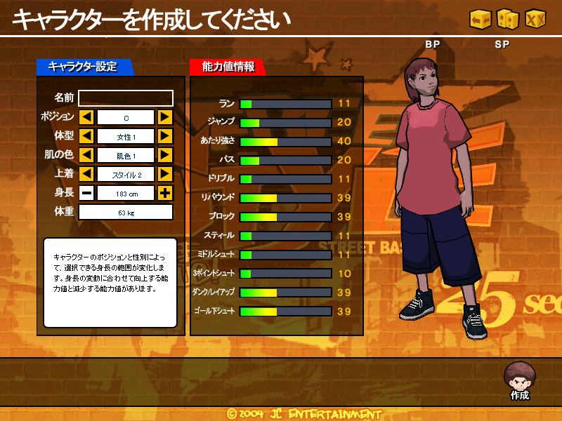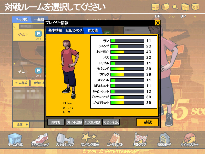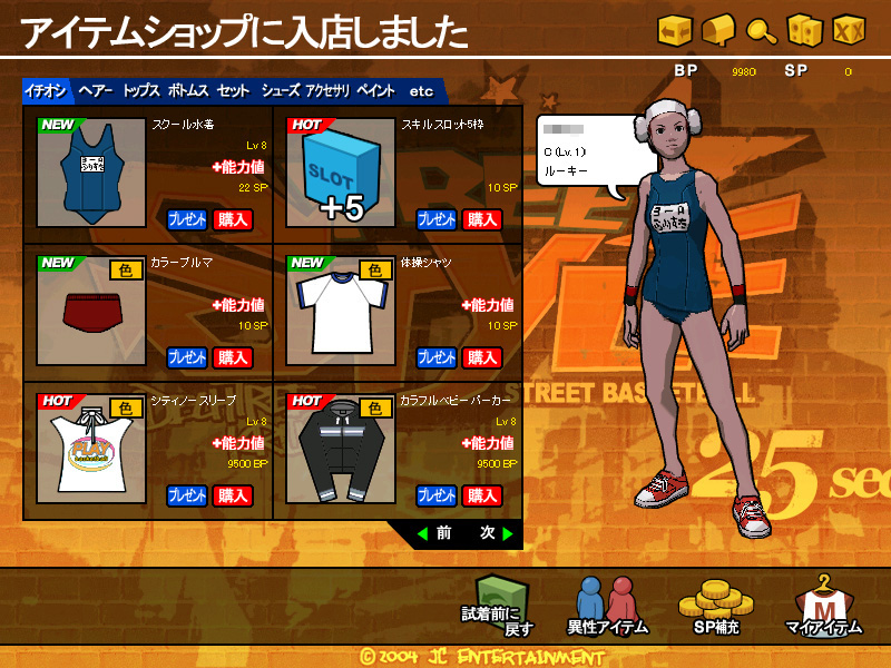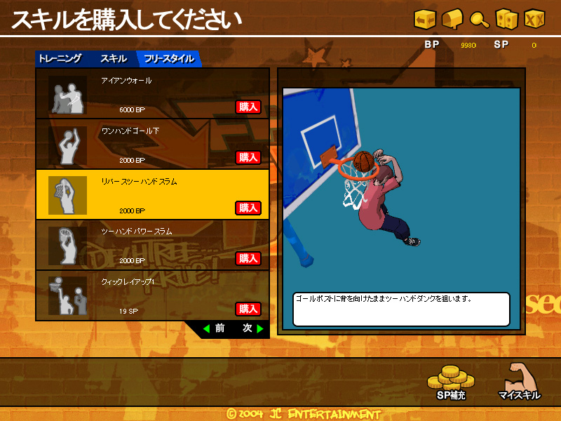 試合後に入手できるゲーム内通貨「BP」や,チャージが必要な「SP」を使えば,洋服や靴,リストバンドといったお洒落アイテムだけではなく「スキル」の購入も可能だ。「ワンハンドゴール下」「チップインシュート」といったスキルは,事前にどんな技なのかを確認してから購入できるし,スキルが有ると無いとでは試合運びが大きく違ってくるので,ぜひとも手に入れたいところ。