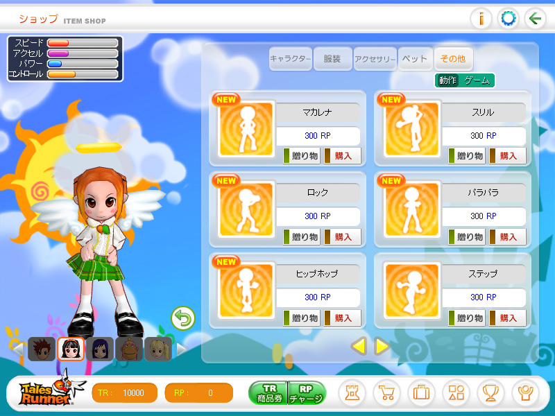 アイテムショップでは定番の洋服,アクセサリ,髪型などのアバターアイテムに加えて,各キャラクターの「モーション」も購入可能。えらく懐かしい「マカレナ」のモーションを見つけてしまったのだが,4Gamer読者の何割が,このダンスを知っているだろうか……。余談だが,筆者は今でも完璧にこれが踊れる。