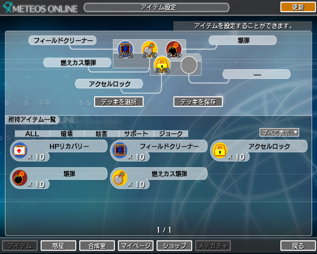 テクニックだけでは防ぎ切れないほどのメテオが積み上がってしまったときのために,お助けアイテムなるものが使用可能だ。「破壊」「妨害」「サポート」「ジョーク」の4タイプ,全19種類のアイテムがあり,すべてのブロックを瞬時に消し去る「フィールドクリーナー」,相手の画面を一部を除いて真っ暗にしてしまう「スポットライト」など,効果はさまざまだ。