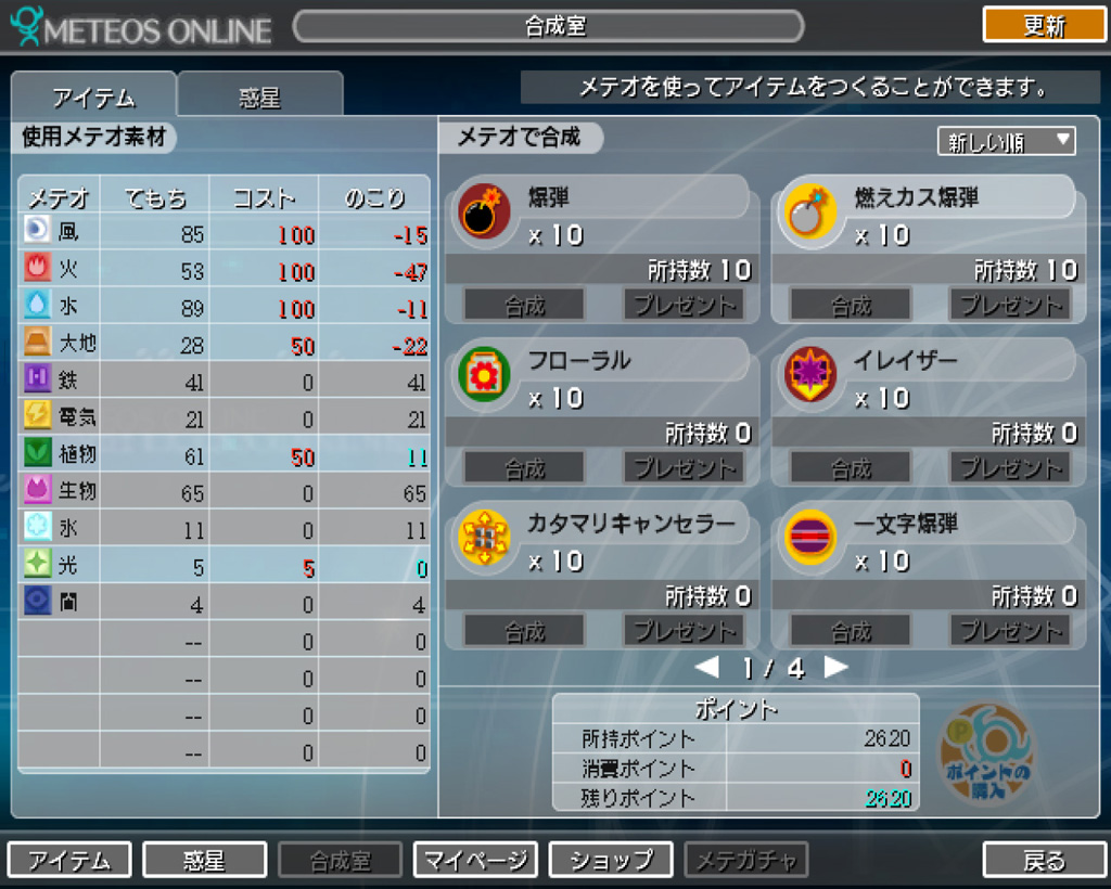 また,新規登録時にはキャラクターのほかに,拠点となる「惑星」を一つ選ぶ必要があり,その惑星が「母星」となる。それぞれの惑星にはメテオの落ち方,重力などに特徴があり,同時に難度も兼ねている。ゆったりとブロックが落下する水の惑星「オレアナ」,小さなブロックを次々に打ち上げるスピーディなプレイ向きの「ファイアム」,連鎖が置きやすいよう,じっくり組み立ててから打ち上げたいなら「アナサジ」……といった選択肢があるのだ。