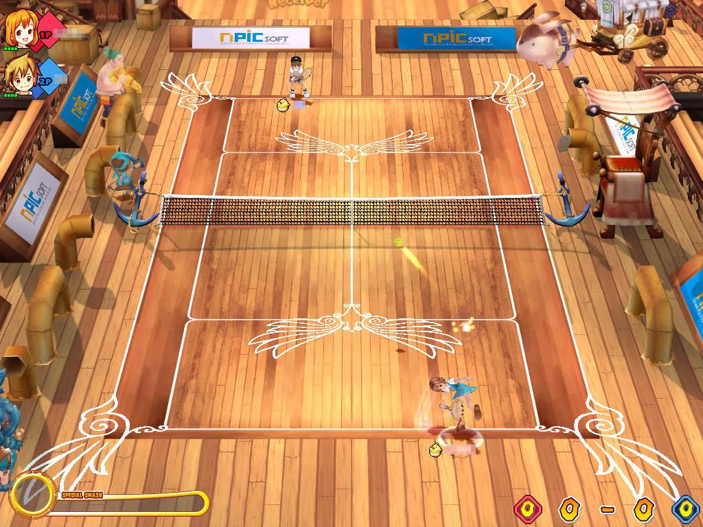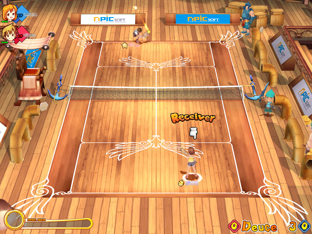 メインメニューには「マイホーム」「マッチプレー」「バトルモン」「クエスト」「チュートリアル」といった5種類の項目があるが,実は未実装の機能が多く,現在選択できるのは「マッチプレー」と「チュートリアル」のみで,ゲームモードは普通にラリーを楽しむ「ベーシックモード」と,ガーディアンと共に魔法を駆使したルールで対戦する「バトルモード」の2種類だけ。それぞれシングルとダブルスでのプレイが可能だ。基本ルールや得点については実際のテニスと何ら変わらないが,細かいルールを知らなくてもプレイには問題ない。とにかく球を相手コート内に打ち返せばよいのだ。