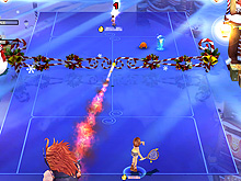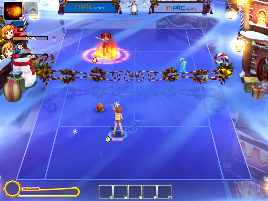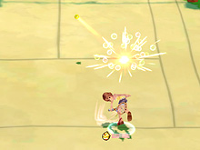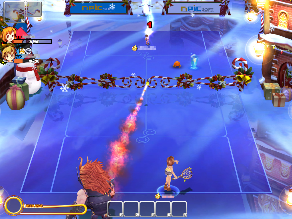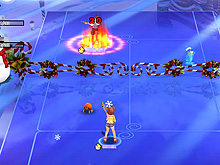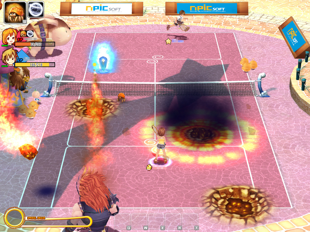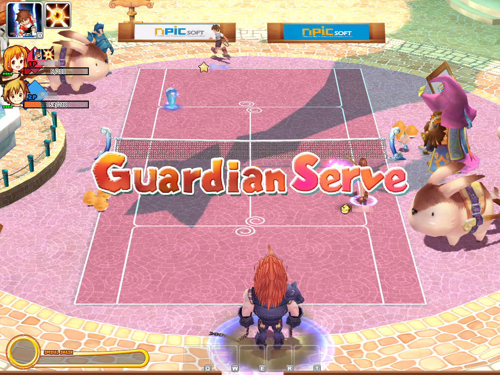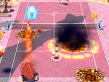| ガーディアンが繰り出すサーブは,プレイヤーキャラクターのそれよりも,速くて力強い。クリスタルで取得したアイテムは,「D」ボタンで発動できる。使用するとドハデな魔法が発動する |
