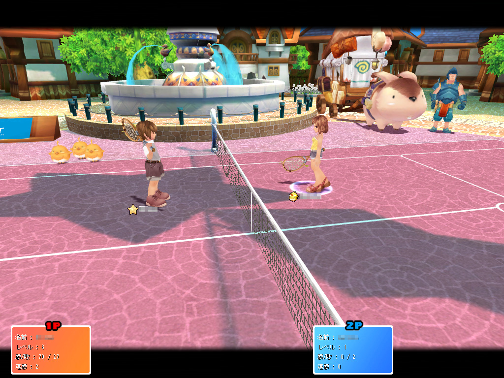 以前の情報では,ファンタテニスはクエスト仕立てになっており,新しいコートでプレイするには,クエストをこなして順次ロックを解除する必要があるとのことだった。しかし現時点ではクエスト未実装のため,船の甲板から氷上まで全5種類のコートは,誰でもプレイ可能。コートの種類は見た目が変わるだけで,氷の上だとキャラクターが滑りやすいなどの特性は,まだないようだ。