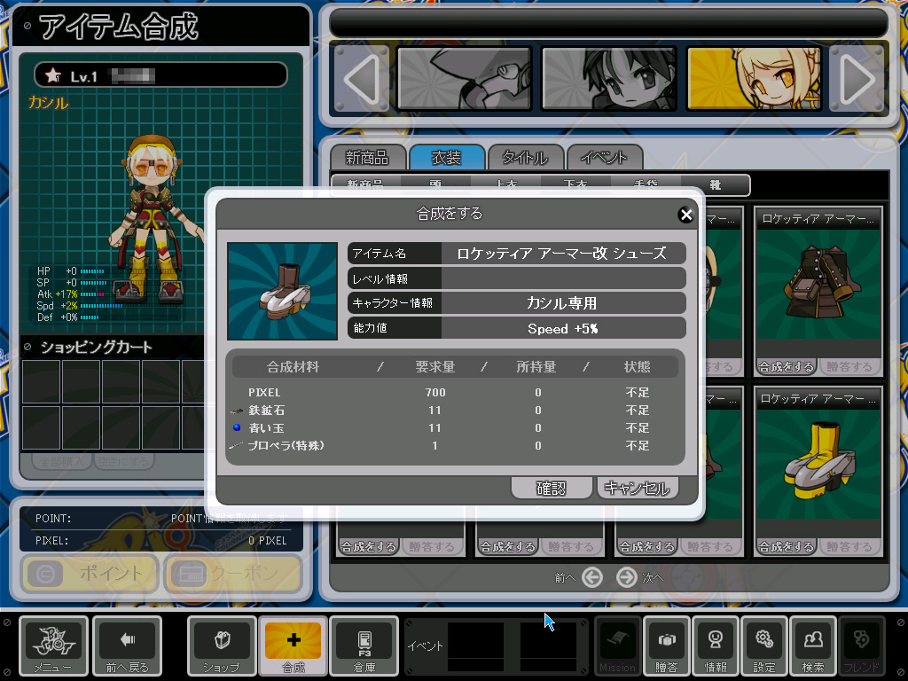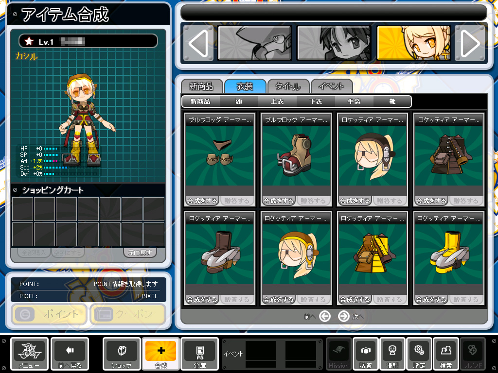 対戦終了後に「青い玉」「製作書」といったアイテムがランダムでもらえるのだが,これを集めると,ショップでも購入できない特殊装備品を合成できるのが,ビッグショットのお楽しみ要素の一つだ。作成できるのはキャラクター別の専用アイテムで,頭,上衣,下衣,手袋,靴の5パーツ。「Speed +5%」など能力値を補強してくれるので,全身合成アイテムを着用すれば,かなり強くなれそうな気がする。