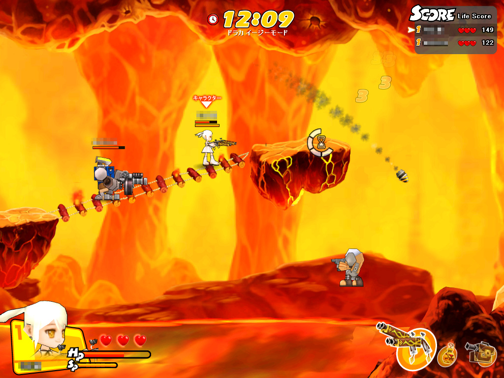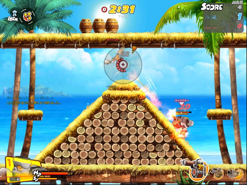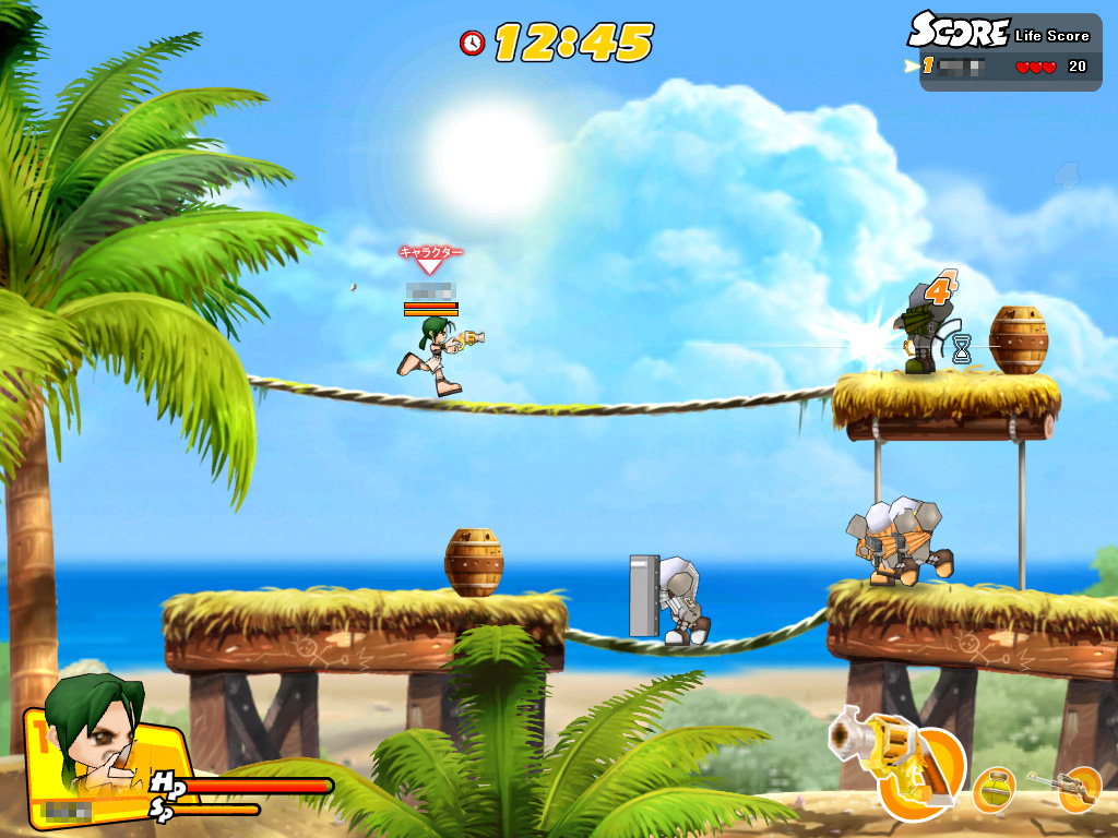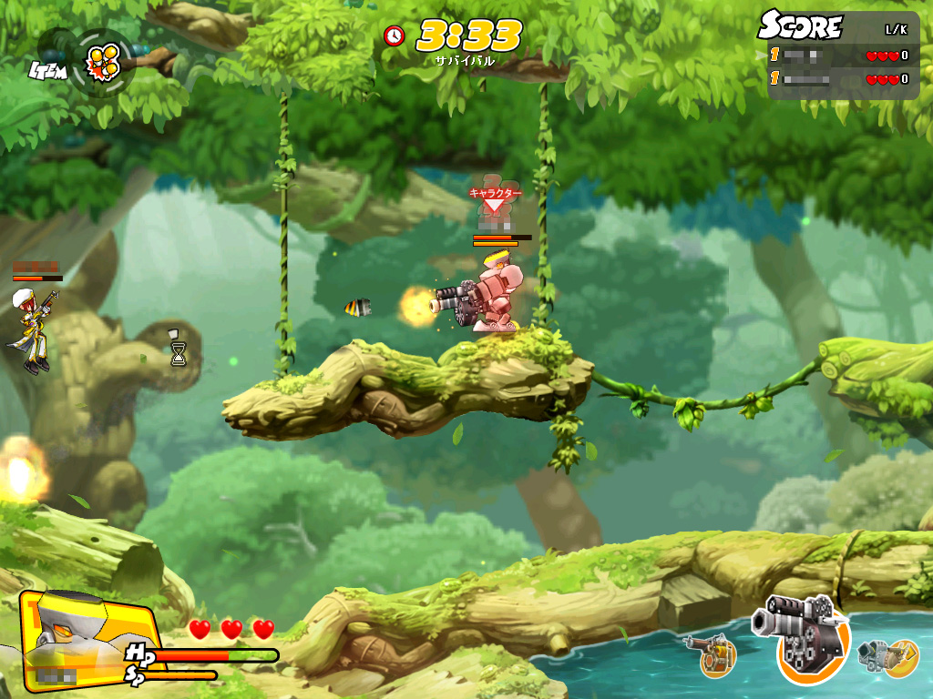 操作はこれ以上なさそうなほどシンプルで,W/Sキーでジャンプ/しゃがむ,A/Dキーで左右移動,左クリックで攻撃,1〜3で武器をチェンジできる。武器はキャラごとに異なるが,1番が基本武器,2番が爆弾系,3番が重火器だ。少年キャラクター「タイ」を例に挙げると,1番はリボルバー,2番はアップルボム,3番はT1だ。