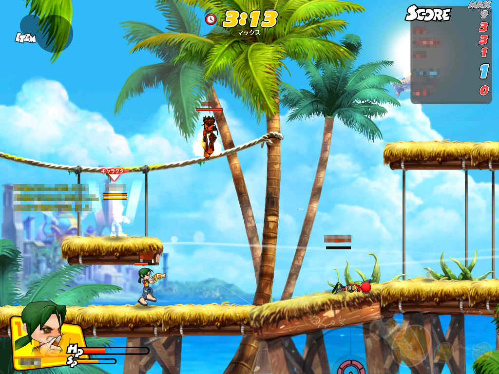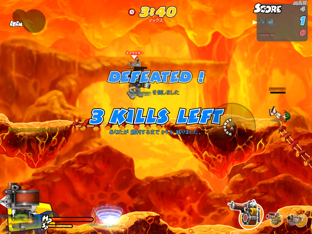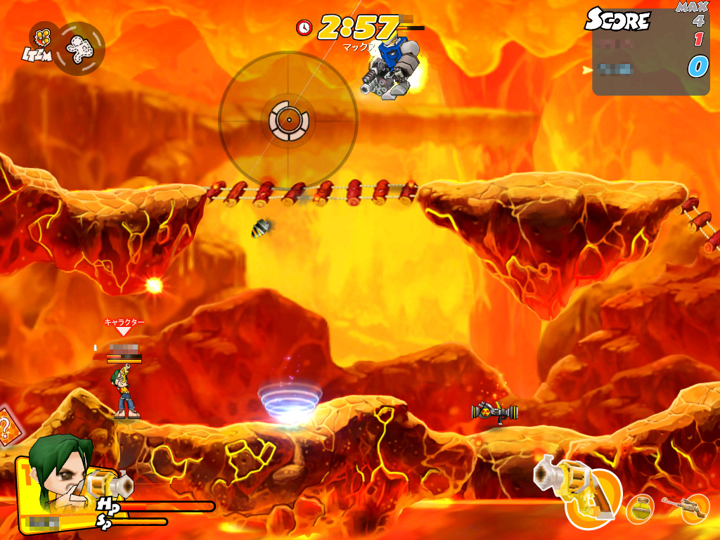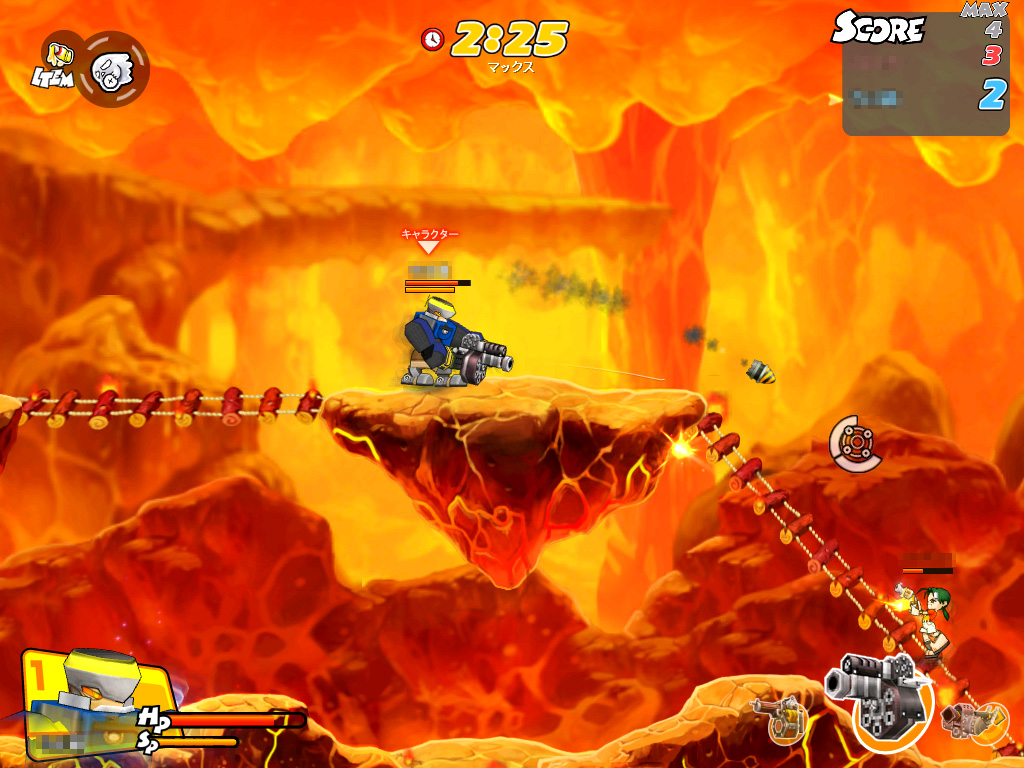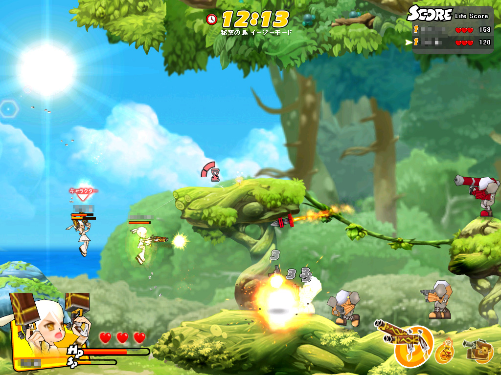 操作はこれ以上なさそうなほどシンプルで,W/Sキーでジャンプ/しゃがむ,A/Dキーで左右移動,左クリックで攻撃,1〜3で武器をチェンジできる。武器はキャラごとに異なるが,1番が基本武器,2番が爆弾系,3番が重火器だ。少年キャラクター「タイ」を例に挙げると,1番はリボルバー,2番はアップルボム,3番はT1だ。
