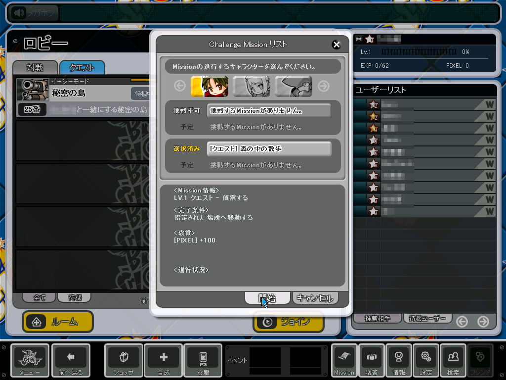 一定レベルに達すると,自動的に受けられるのが「Mission」モード。Lv.1で受けられる「森の中の散歩」は,ただ左から右へ移動するだけで100PIXELがもらえる。一定レベルごとに新たなミッションが追加され,ビッグショットのバックストーリーに関係する,悪の企業「ジャミロカンパニー」などが敵として登場する。ミッションをクリアすれば,ゲーム内通貨だけでなく経験値増加などのボーナスもあるので,必ずチェックしておきたい。