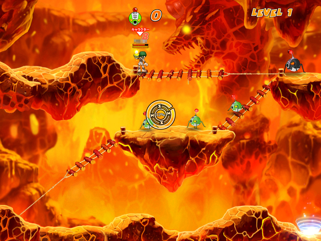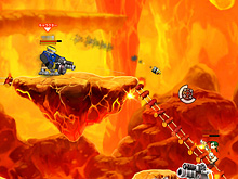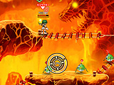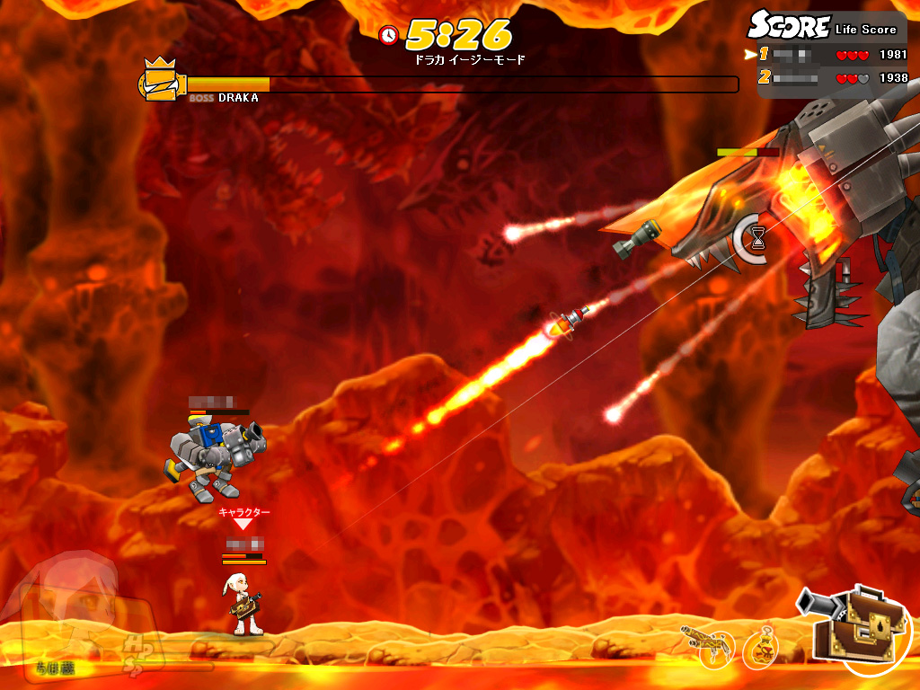 | 旅人を襲う謎の怪物の噂を聞きつけ,調査に訪れるタイ達。溶岩の中から現れるドラゴン風ボスは,その巨大な全身のうち特定の位置を撃たねばならない |
