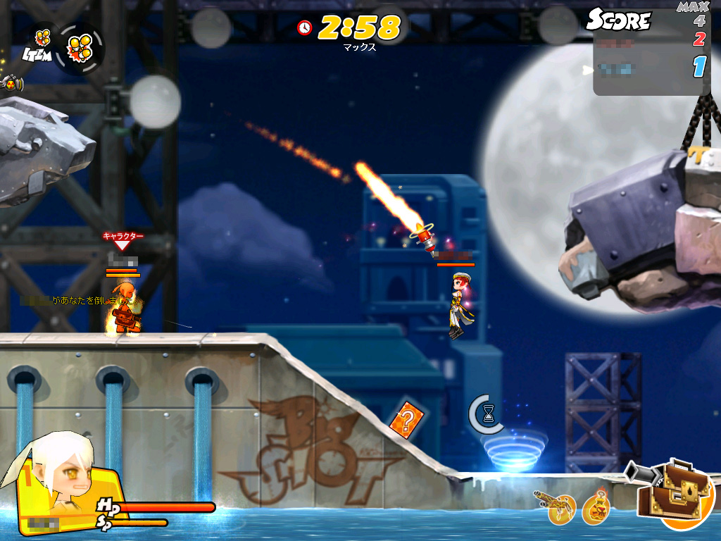 対戦は一部屋に最大6名のプレイヤーが参加でき,個人戦または2vs.2,3vs.3のチーム戦が選べる。対戦モードには「マックス」と「サバイバル」の2種類があり,マックス戦はキル数の上限が設けられ誰か一人がそれに達するとゲーム終了。サバイバル戦はライフ×3を各キャラクターが持ち,すべてのライフを失えば戦線離脱。最後の一人が勝者となるルールだ。