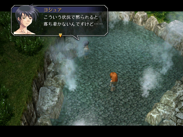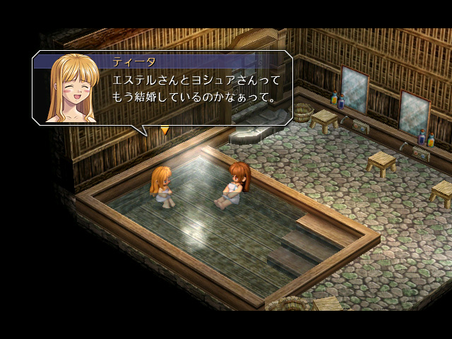 | ストーリー各所でヨシュアとの関係を勘繰られるエステル。これをきっかけにだんだんとヨシュアのことを意識するようになっていき……というのは幼馴染シナリオの黄金パターンといえよう | 露天風呂で鉢合わせしてドッキリ。実にありがちなシーンである。いや,つくづく風呂の好きな作品だなあ | |