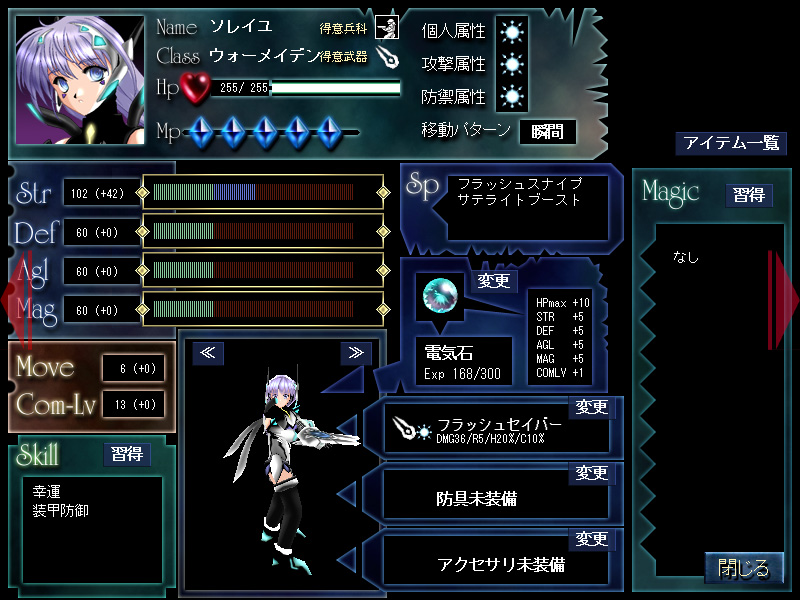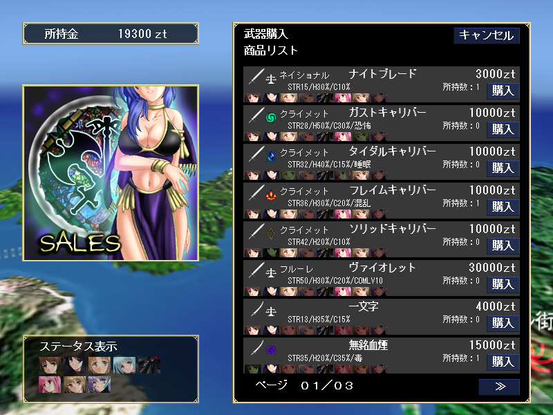 | キャラクターのステータス画面。ここから武器,防具,アクセサリの変更が行えるほか,スキルや魔法の習得や秘石の交換も可能だ | 武器/防具やスクロール,書物など各種アイテムを購入できるSHOP。もっとも,今作ではむしろドロップアイテムに面白いものが多い | ゲームの進行は例によって,地図上でマーカー(キャラクター)を移動させる形になっており,サブクエストもいくつか用意されている |