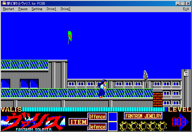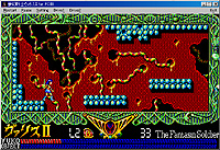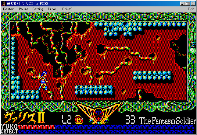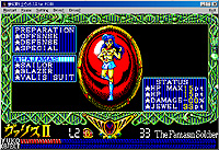 | ヴァリスのアクションパート。進行方向は画面右下に矢印で示され,その方向にキャラクターを進める。出自はPC-88シリーズなので,画面は640×200ドット・512色中8色。その割には頑張っていると思ってほしい | 同じくヴァリスIIのゲームパート。ヴァリス初回作と比べると画面のデザインは工夫されているものの,さすがに表現力の絶対的な不足はいかんともしがたく,ぎらぎらした画面の印象はあまり変わっていない |