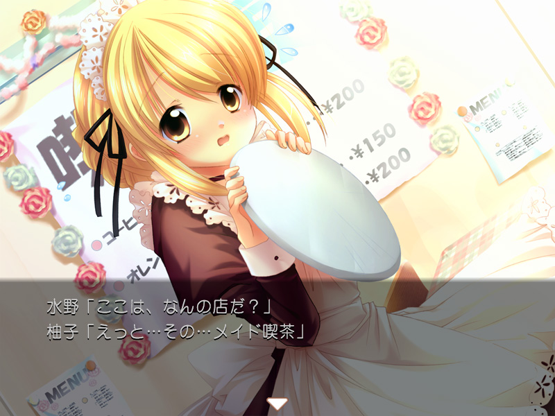 | 学園祭にて。「来るな」と柚子に念を押されていた主人公だが,あえて行ってみたところ,出し物はなんと「メイド喫茶」。これも時代の流れなのであろうか |