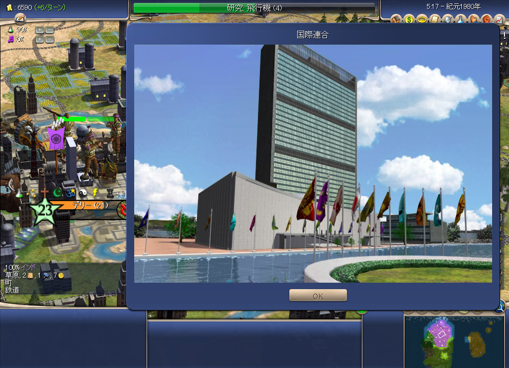 国連もまた,このゲーム中には世界遺産として登場する。外交勝利を狙うためには,ほぼ必須といってよい存在になっている |