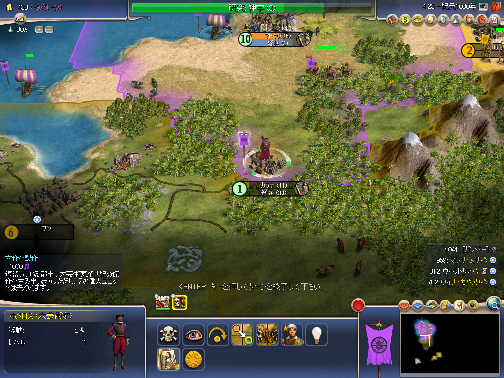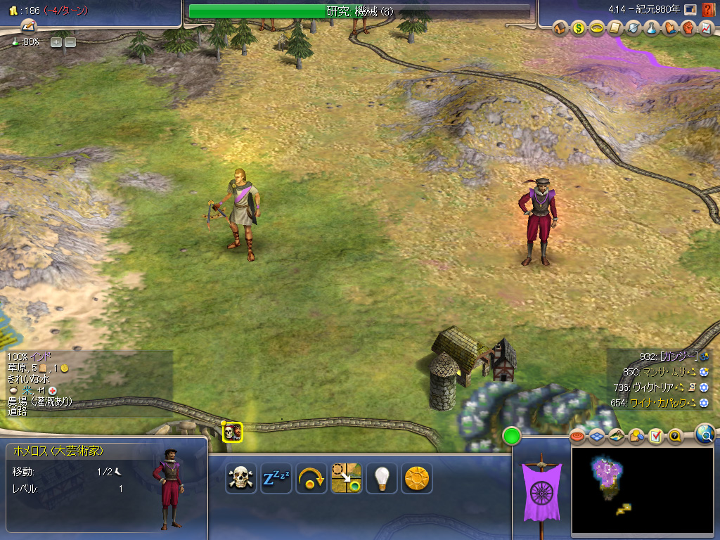 ここまで説明したところで,先週の続きに入ろう。宗教を(うまく行っていれば)取り,第2都市を作る開拓者と,自都市の経済圏内で資源活用施設を動かす労働者を作ったあと,次の一手をどう打つか? という話だ。