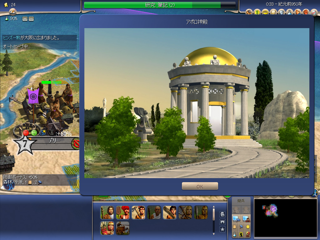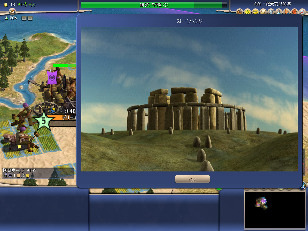 効果のほうだが,ストーンヘンジを建てると自文明の全都市にオベリスクが建てられているのと同じになり,都市の文化圏が広がりやすくなる。このあと都市数を4〜6個くらいまで増やすに当たって,資源を押さえやすくなるのだ。一方デルフォイの神託所には,「発明/発見可能だがまだ手に入れていない技術を一つ,即座に獲得できる」という効果がある。そしてこの両方とも,「大預言者」の誕生に寄与してくれるのだ。