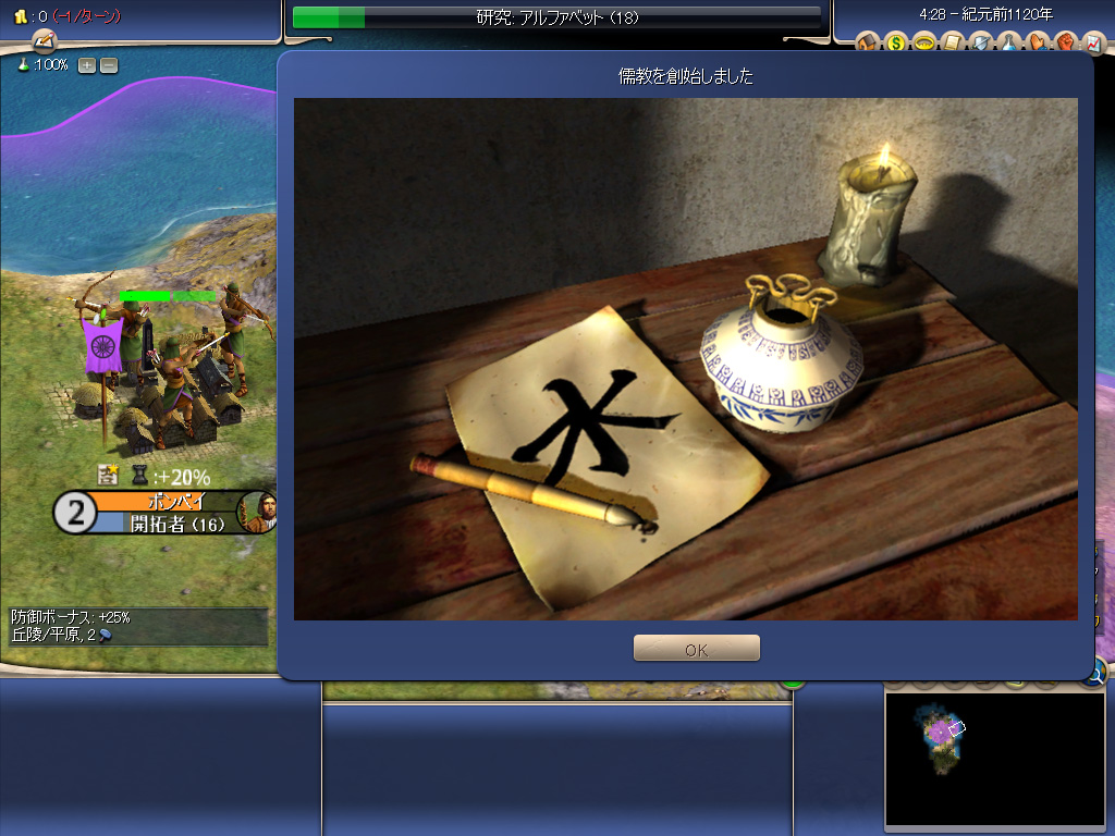 石工術がまだなければ,「瞑想」と「多神教」(どちらかは最初の宗教チャレンジで取ってあるはず),「筆記」を自力で開発したうえで大預言者を使うと「法律」が取れ,儒教が入手できる。
