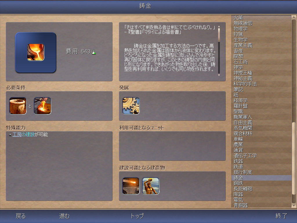 ただし,筆者はそれよりも「鋳金」または「法律」を取ることをお勧めしたい。鋳金は開発コスト450(基準値。難度やゲーム進行によって増減する)。アルファベットは300なのでコスト=入手価値は1.5倍ある。「陶器」「青銅器」の技術があらかじめ必要だが,これを満たすのは難しくない。