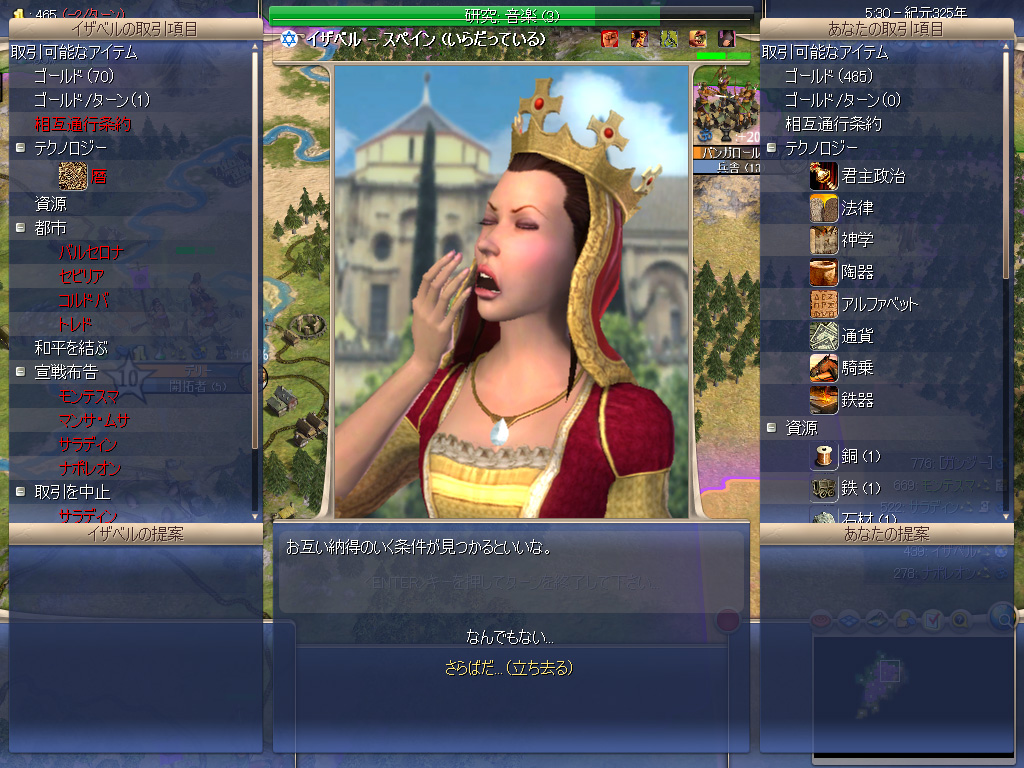 技術交換や国境開放には,一向に応じてくれないイザベル。実は,こちらの国教を彼女に合わせてやれば,とても親しく付き合えるのだが……。国教の違いが不仲を招く場合の対処法には,しかるべき回であらためて触れたい