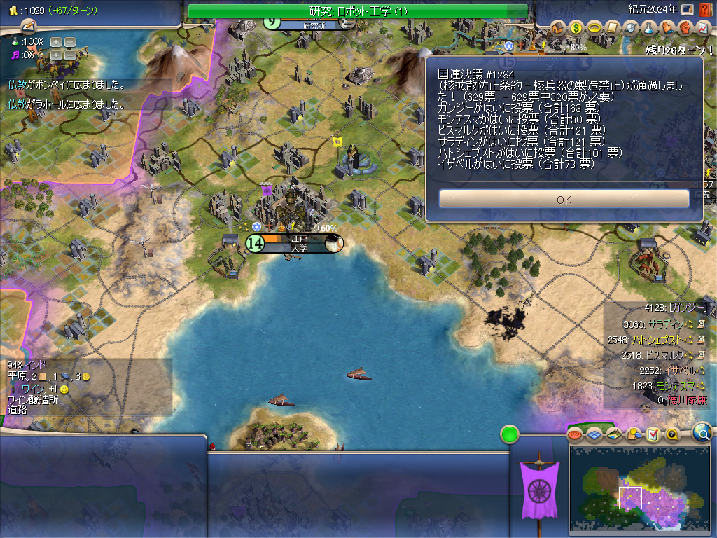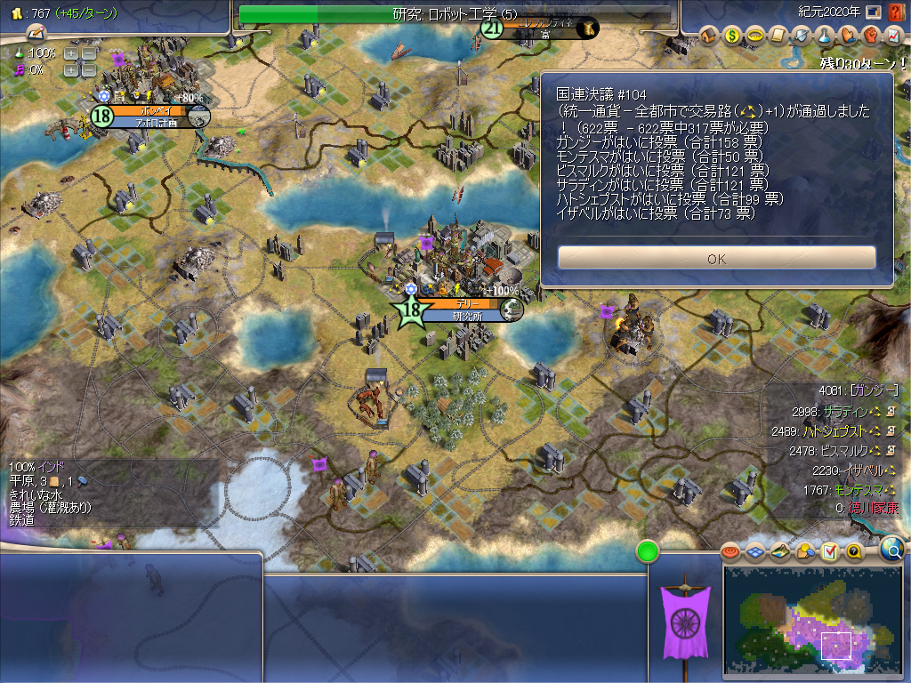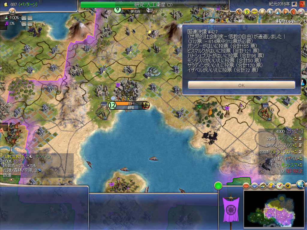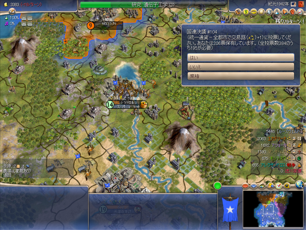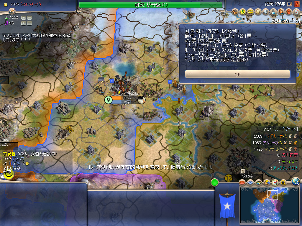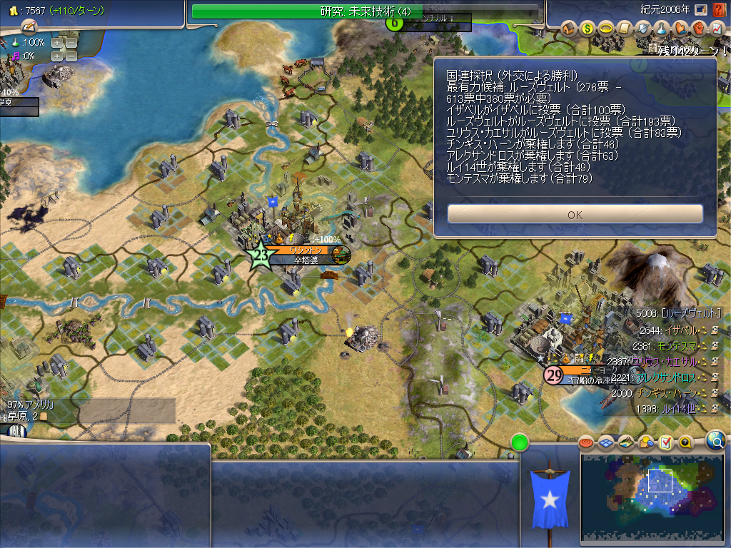 国連による外交勝利を目指す場合,あまり極端な内政中心プレイを目指すわけにはいかない。なにしろ世界人口の61%の世論を一文明で掌握するのだから,そこまでの圧倒的大差を,内政だけでつけるのはまず不可能だ。思えば国際連合とは,二度にわたる世界大戦の落とし子であったのだなあと,理想と現実の果てしない懸隔をめぐって,しばし感慨にふけってみる。