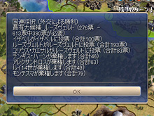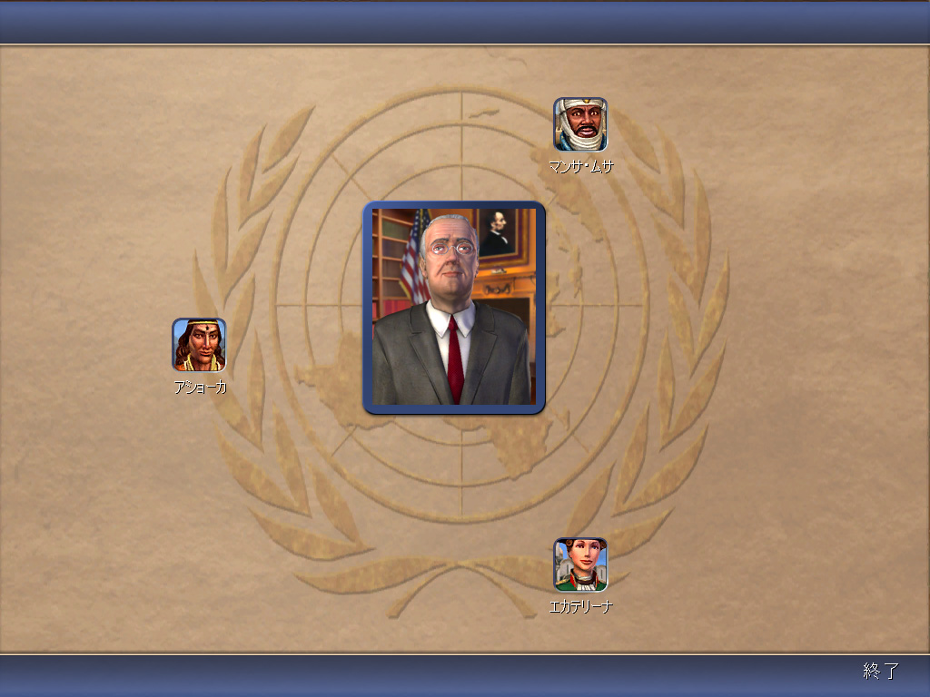 Civ4の勝利条件に,外交勝利というものがある。これは,国際連合が世界に存在している状況において,国連決議で「自国の勝利を承認させる」ことだ。