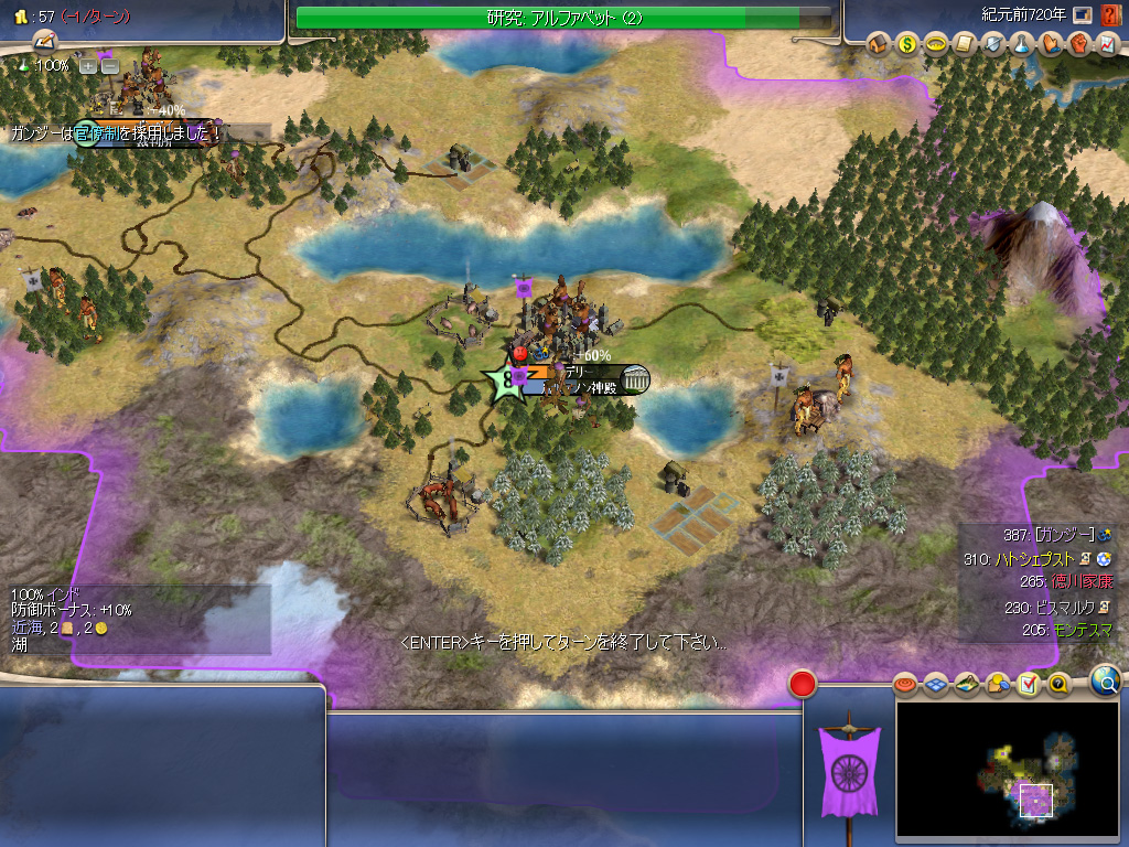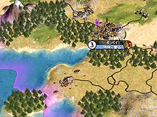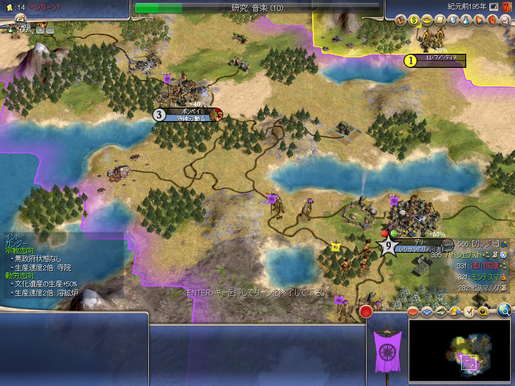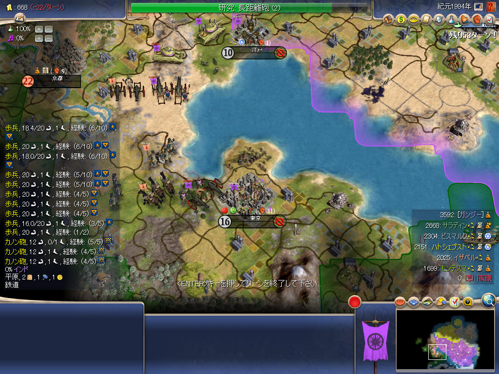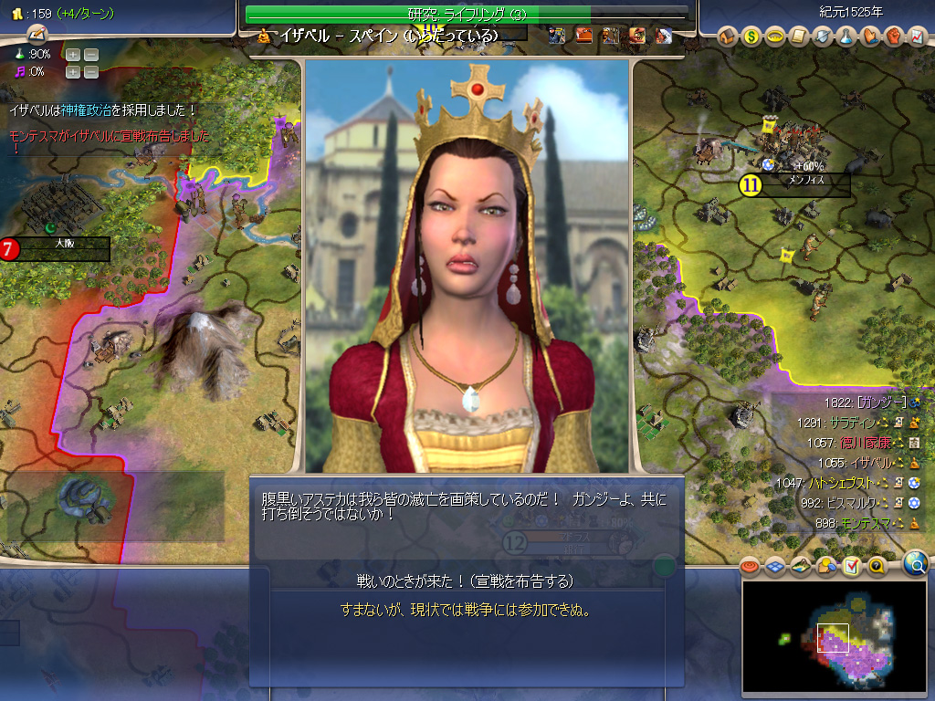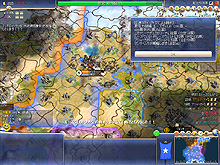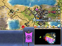 右下のミニマップに注目。西に日本領が広がっていて,その西に存在する文明との交易や布教ができない状態だ