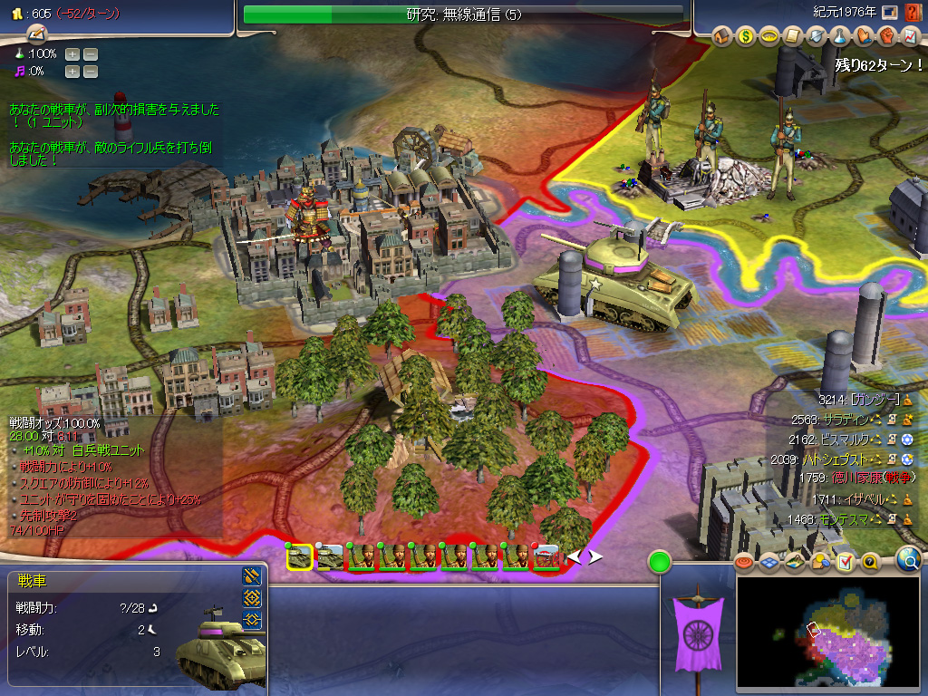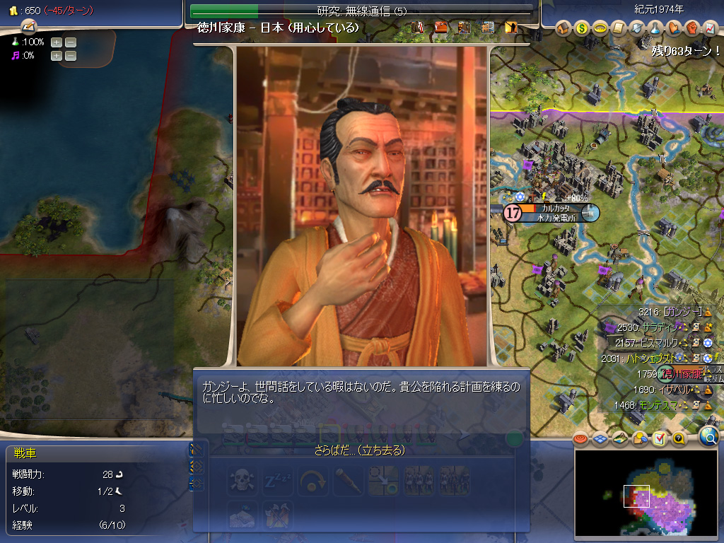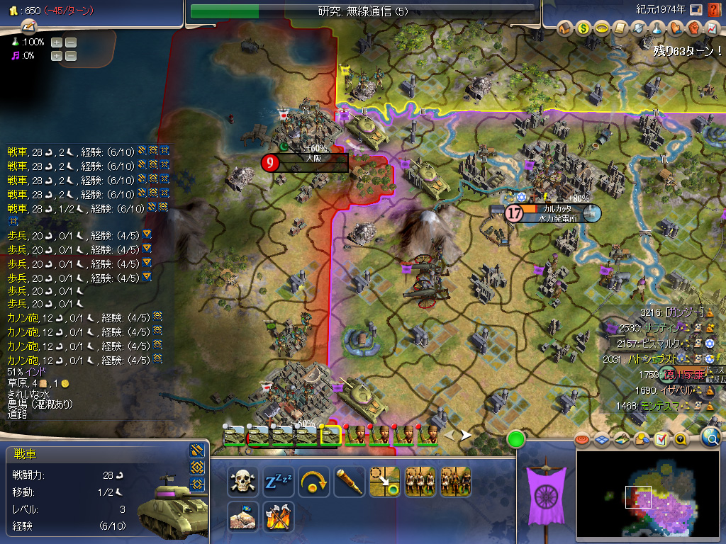 途中,友好関係を深めていったハトシェプストのエジプトから,都市が我がインドに寝返ったり,アステカのモンテスマとスペインのイザベラが,彼らの国教である仏教を信じない者など許さないと怪気炎を上げるなか,インドにまで仏教が伝わってくる気配がなくてドキドキしたりと,微妙に想定外の展開はあったものの,おおむね大きな問題もなく現代に入り,戦車の量産体制も整った。