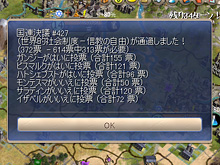 そもそも戦争に努力して勝てない文明が,強制的な平和のルールで浮かばれるかというと,それはたいへん難しい。ぶっちゃけこのゲームにおける国連とは,戦争という不毛な蕩尽を節約するための即物的な仕組みであって,世の中から不公正を追放するとか,そんな崇高な理念を感じさせる働きは,そうそう期待できない。言葉を換えて表現するなら,強い者がその強さを別の形で発揮する場,それが国連だ。もちろん,不条理な死を減らすこと自体に,大きな意義があるとしても,である。