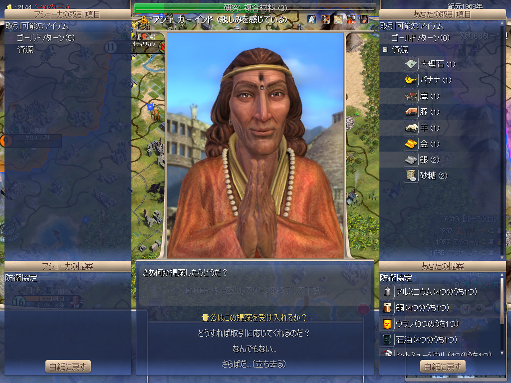 そんな,なんとなく身につまされる感じの認識を心に秘めつつ,国連を中心としたプレイが実際どのようになるのか,インド(ガンジー)で試してみた。いやさ椎名 誠さん流に言えば,インドでわしも考えた,というところか。