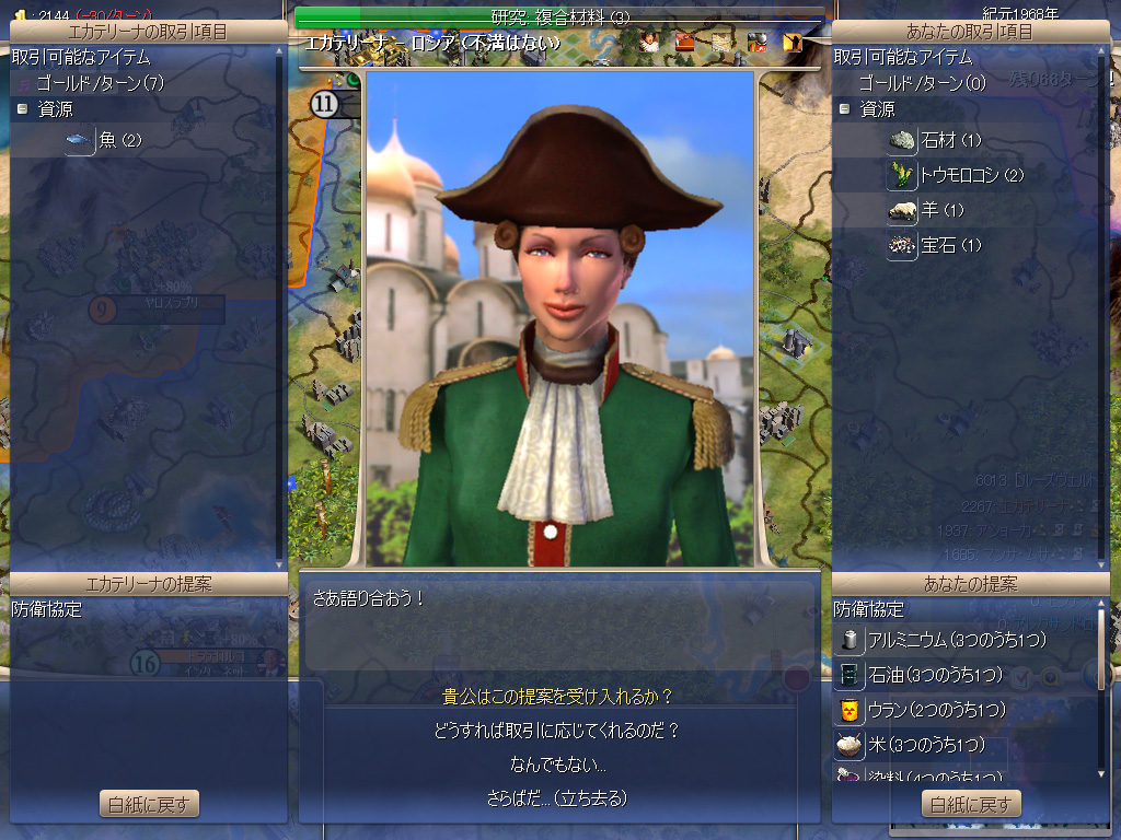 ちなみに国連で外交勝利を決定するための,本当に「外交的」な手段としては,どこか一国を悪者にし,その国に対する防衛協定を結んだうえで外交勝利を協議にかける,というものがある。なんだか現実世界でも最近似たような光景を見た気がして,微妙にリアルで困りものだが,それはさておき,ここはひとつアステカを悪者にして,エジプト,ドイツと防衛協定を結んでみれば……と思ったが,どう交渉しても答えはノー。正直手詰まりだ。