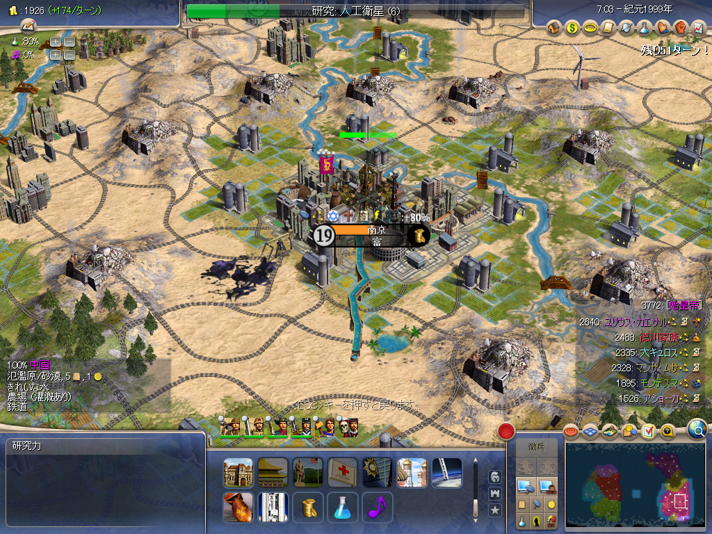 そこで,とりあえず「製鉄所」と「英雄叙事詩」を重ね,「素早く軍事ユニットが作れる都市」を目指す手もある。ただ,これはこれで,終盤に世界遺産や宇宙船パーツの建造を続ける場合,英雄叙事詩の効果が無駄になってしまうという難点がある。まあ,このあたりは好みやその時々の展開に応じて判断するしかない。