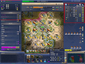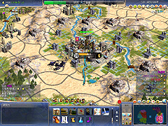 また,隣接都市と都市圏が重なっているところにこうしたハンマー生産系のマスがあれば,一時的にそのマスを利用する都市を変えることも可能だ。先に,現在そのマスを利用している都市の画面で,そのマスから市民を外す。そして,利用したい都市の画面に移り,そちらで市民を配置し直せばよい。これは,ゲーム中盤に食糧不足が発生したときなどにも使える手法だ。